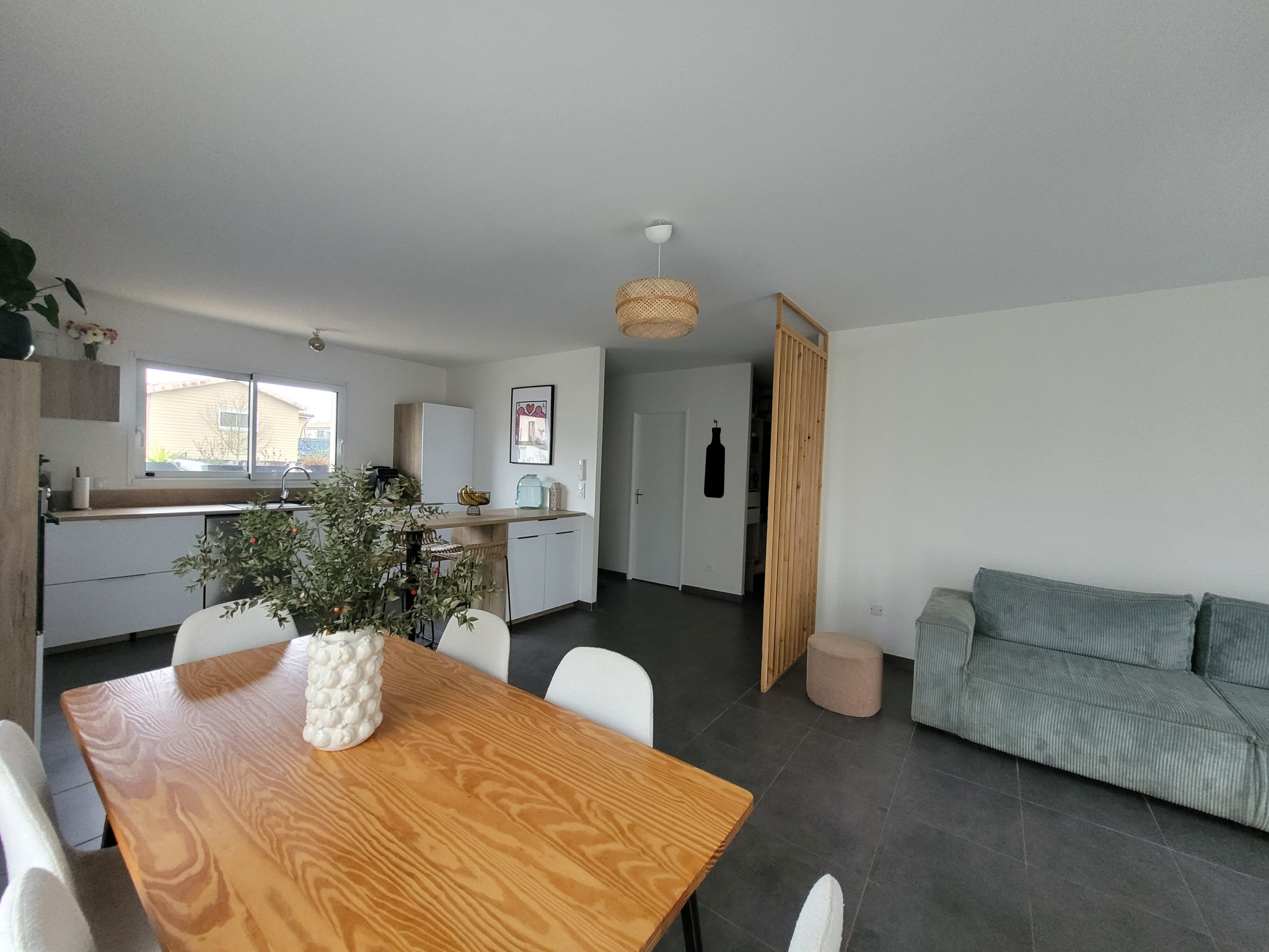 L'entrée s'ouvre sur la pièce de vie de plus de 42 m2 lumineuse grâce à ses nombreuses ouvertures, et équipée de la climatisation réversible.
