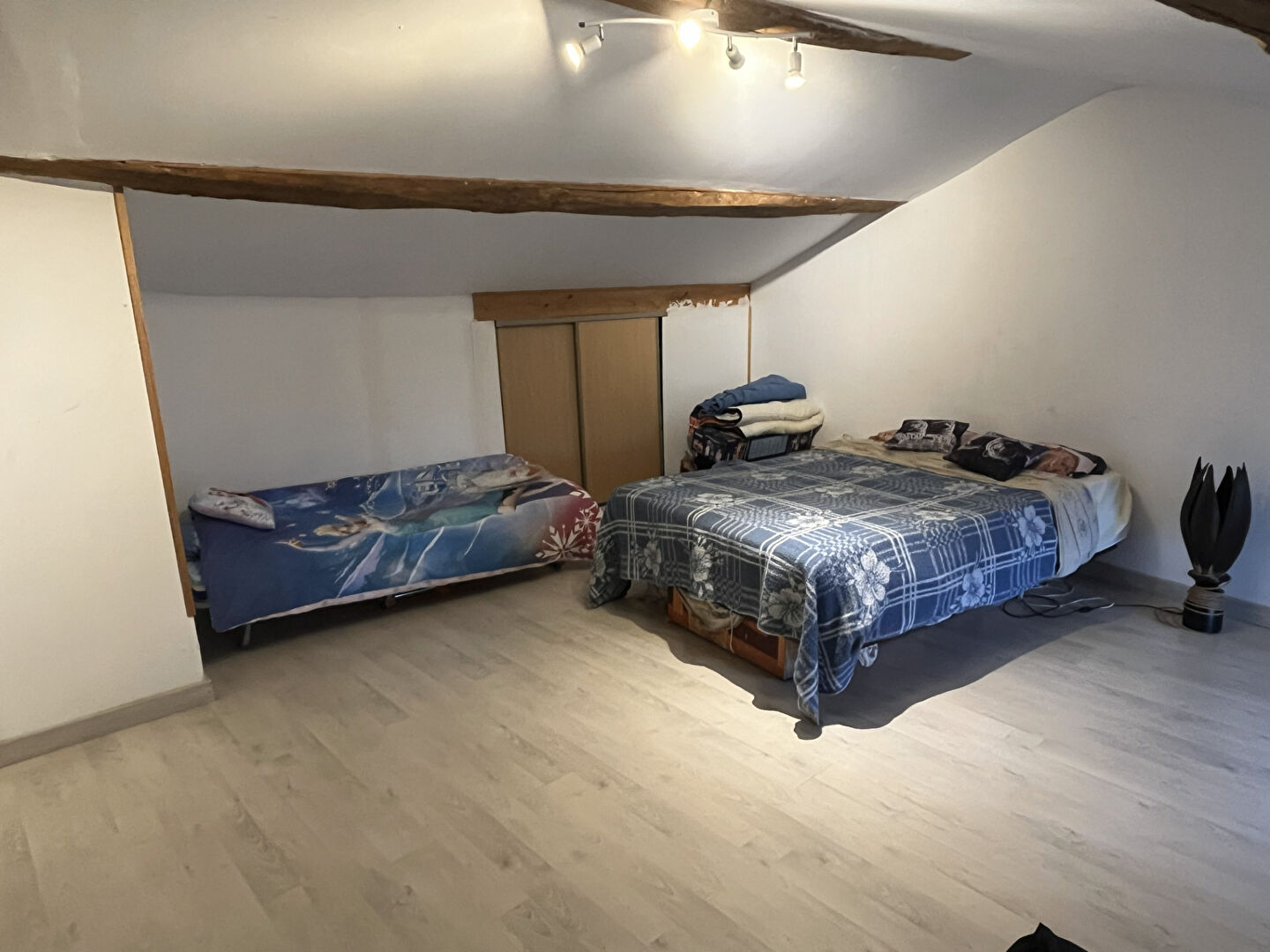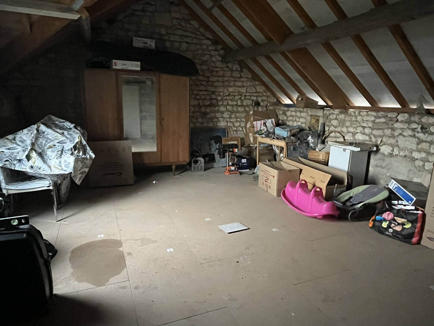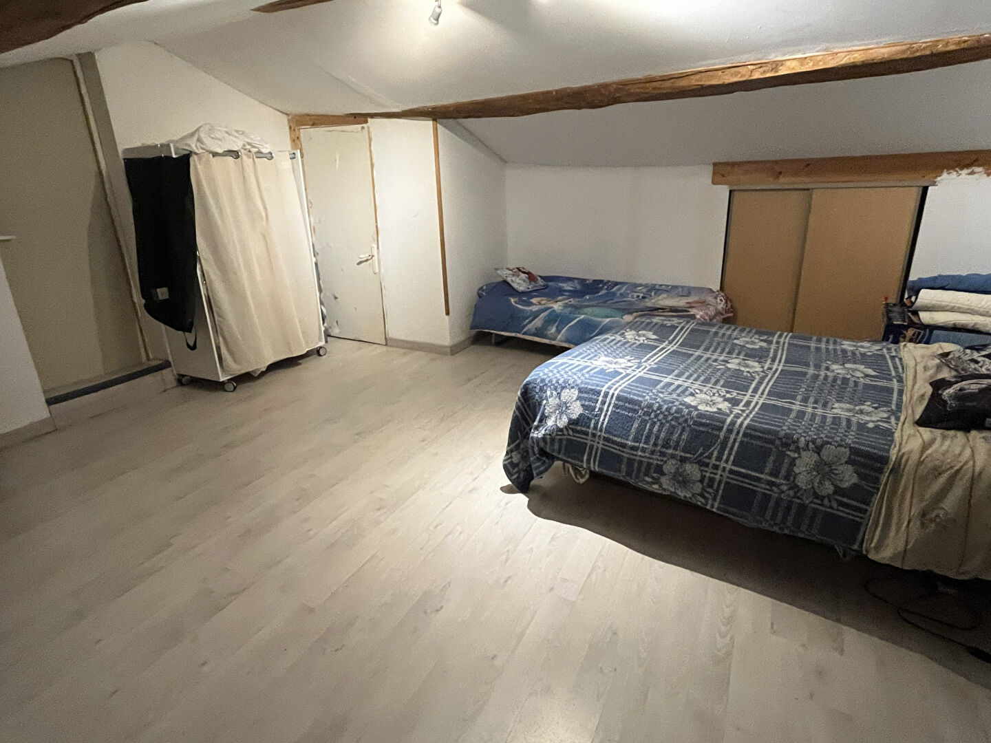 À l'étage, vous découvrirez une mezzanine, une chambre ainsi qu'un grenier pouvant être aménagé pour créer une ou deux chambres supplémentaires. La toiture et la charpente sont en bon état, et l'assainissement est collectif.