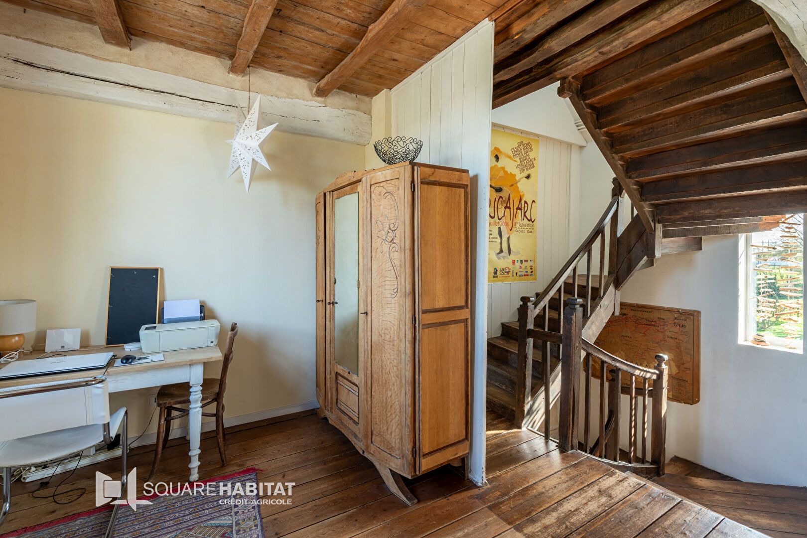 - au rez-de-chaussée : entrée, cuisine (28m²), pièce palière, salon avec poêle à bois (30m²), WC