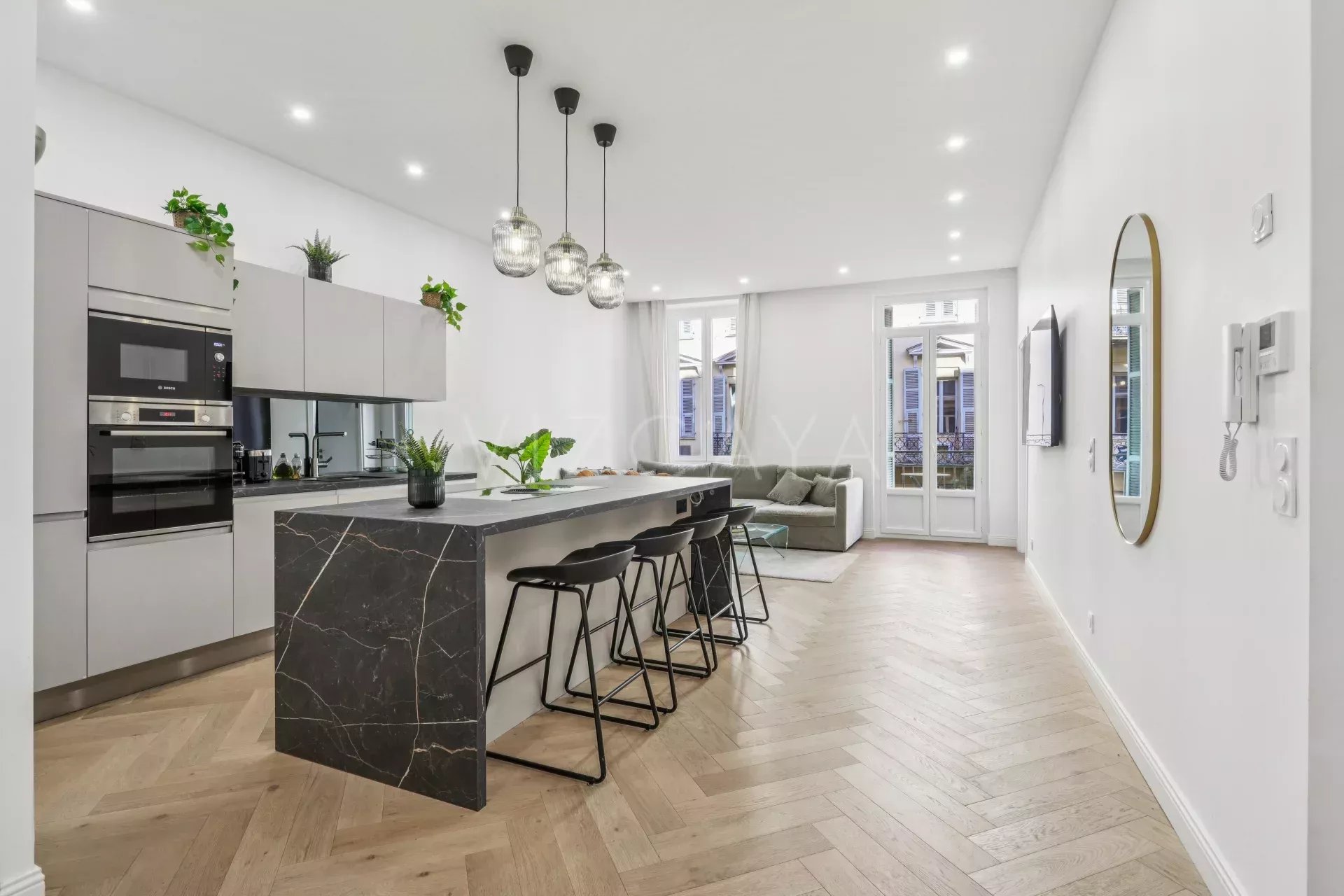 À deux pas de la place Garibaldi, de la place du Pin et à 100 m de la mer, superbe 3 pièces de 67 m² Carrez, entièrement rénové et vendu clé en main, situé au 2? étage .