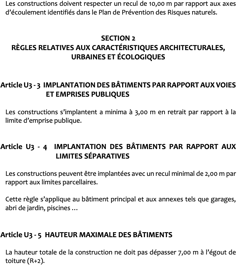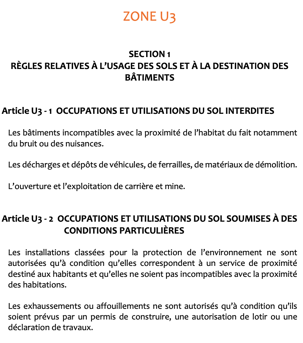 Classé en zone U3 du Plan Local d'Urbanisme, ce terrain permet la réalisation de divers projets immobiliers : construction résidentielle, activité commerciale ou artisanale, dans une logique de mixité favorisant le dynamisme du secteur et limitant les déplacements vers le centre-ville.