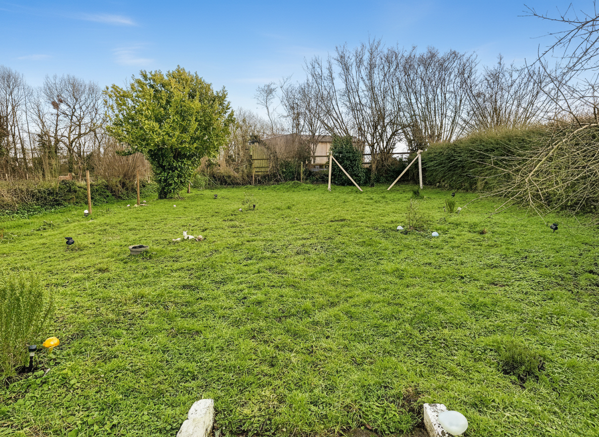 Le terrain de 1 555 m2 comprend un espace jardin pratique pour les animaux et une cour permettant un stationnement facile. Une dépendance en pierre et masse est également présente, bien qu'elle nécessite des travaux importants ou une déconstruction selon le projet.