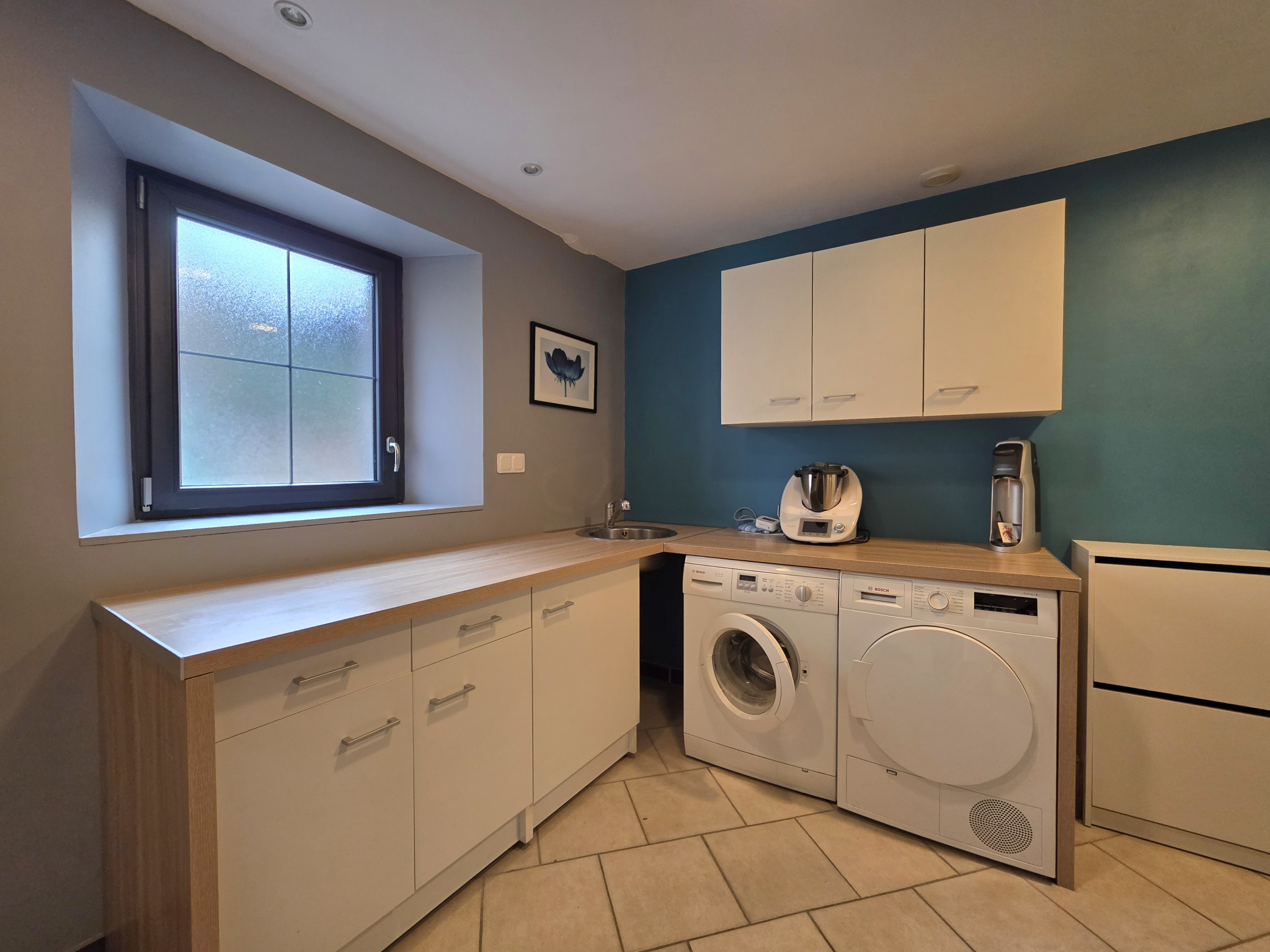 Au rez-de-chaussée, un salon de 33m2, une cuisine de 13m2, une buanderie, un WC et un garage de 25m2.