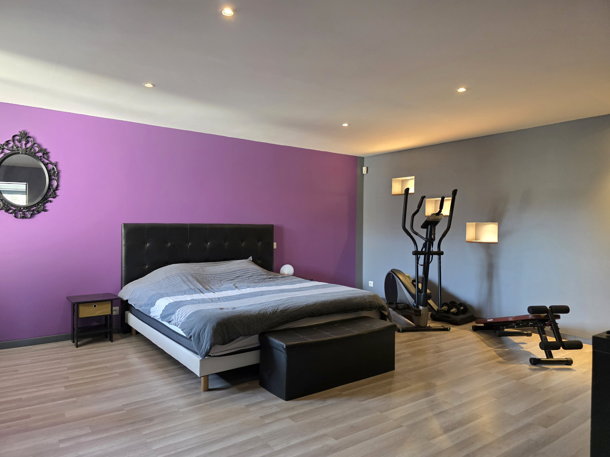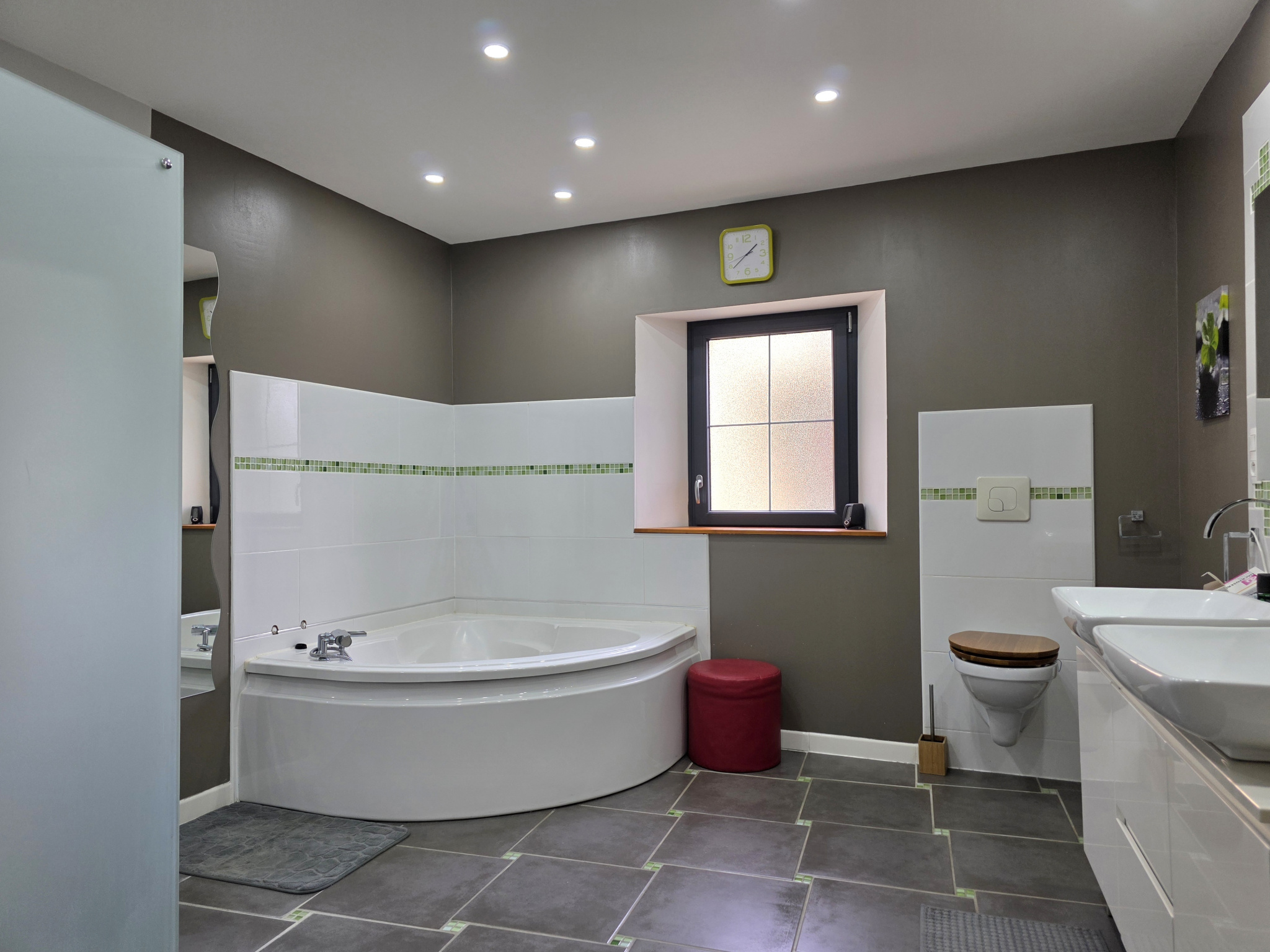 Au premier étage, un palier spacieux, aménagé actuellement en espace bureau avec rangements, dessert un dressing de 10m2, une chambre de 13m2 avec placard et une autre grande chambre de 24m2 avec salle de bains attenante proposant douche, baignoire et WC.