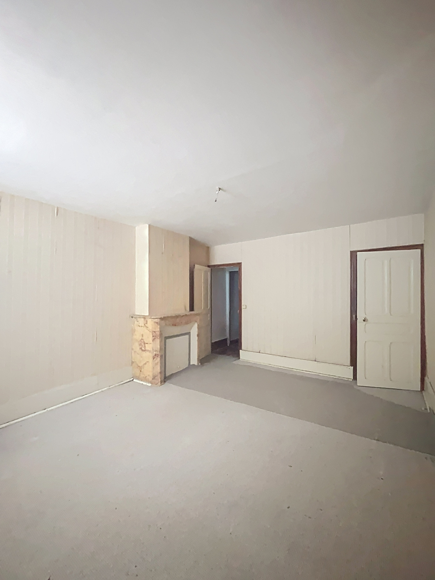 Au 1er étage : - Palier (1,70m2) : sol revêtement plastique ; - Séjour (19,55m2) : sol moquette sur plancher, fenêtre bois ; - Cuisine (8,90m2) : sol revêtement plastique sur plancher, anciens éléments hauts et bas de rangement, hotte ; - Dégagement avec WC (1,45m2) : sol revêtement plastique sur plancher ; - Salle d'eau (2,40m2) : sol carrelage, douche ; - Chambre 1 (18,60m2) : sol moquette sur plancher, ancienne cheminée, fenêtre bois ;
