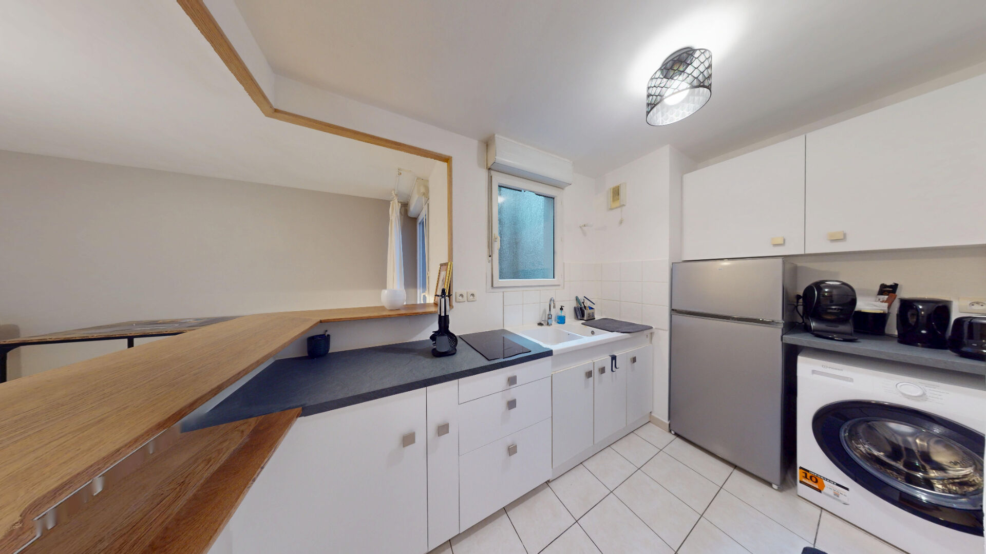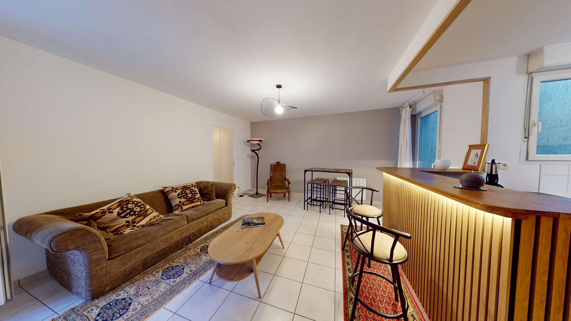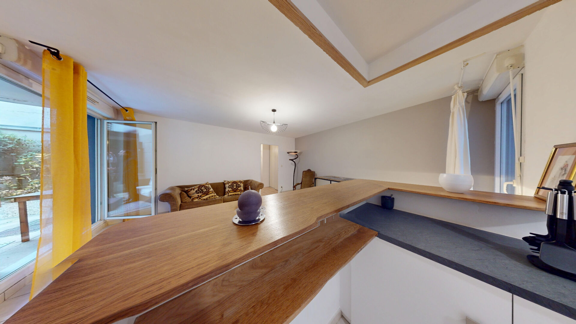 Entrée avec rangements, beau séjour de 19m² avec une cuisine semi ouverte rénovée récemment séparée par un bar rétro éclairé. Accès à une petite terrasse de 3m² environ et à un beau jardin de 34m² composé de dalle, gravillon et d'arbustes idéal pour recevoir.