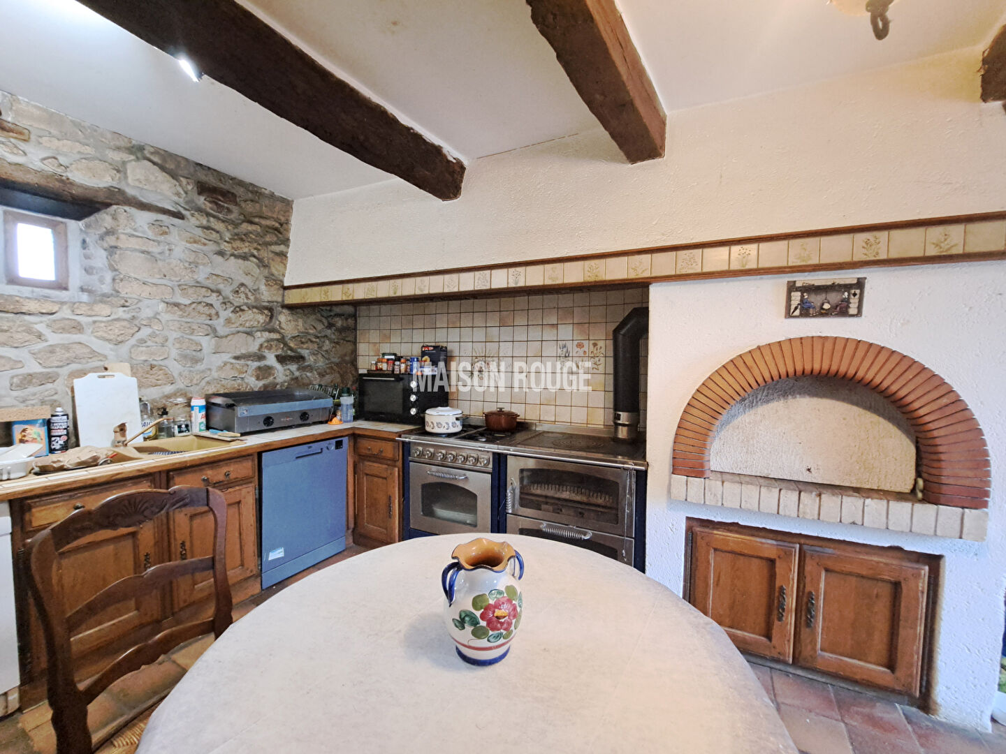 La maison propose une entrée accueillante, des pièces de vie chaleureuses agrémentées de poêles à bois, une cuisine aménagée, ainsi que trois chambres confortables. Une salle de bains avec baignoire et douche et deux WC complètent l'espace de vie.