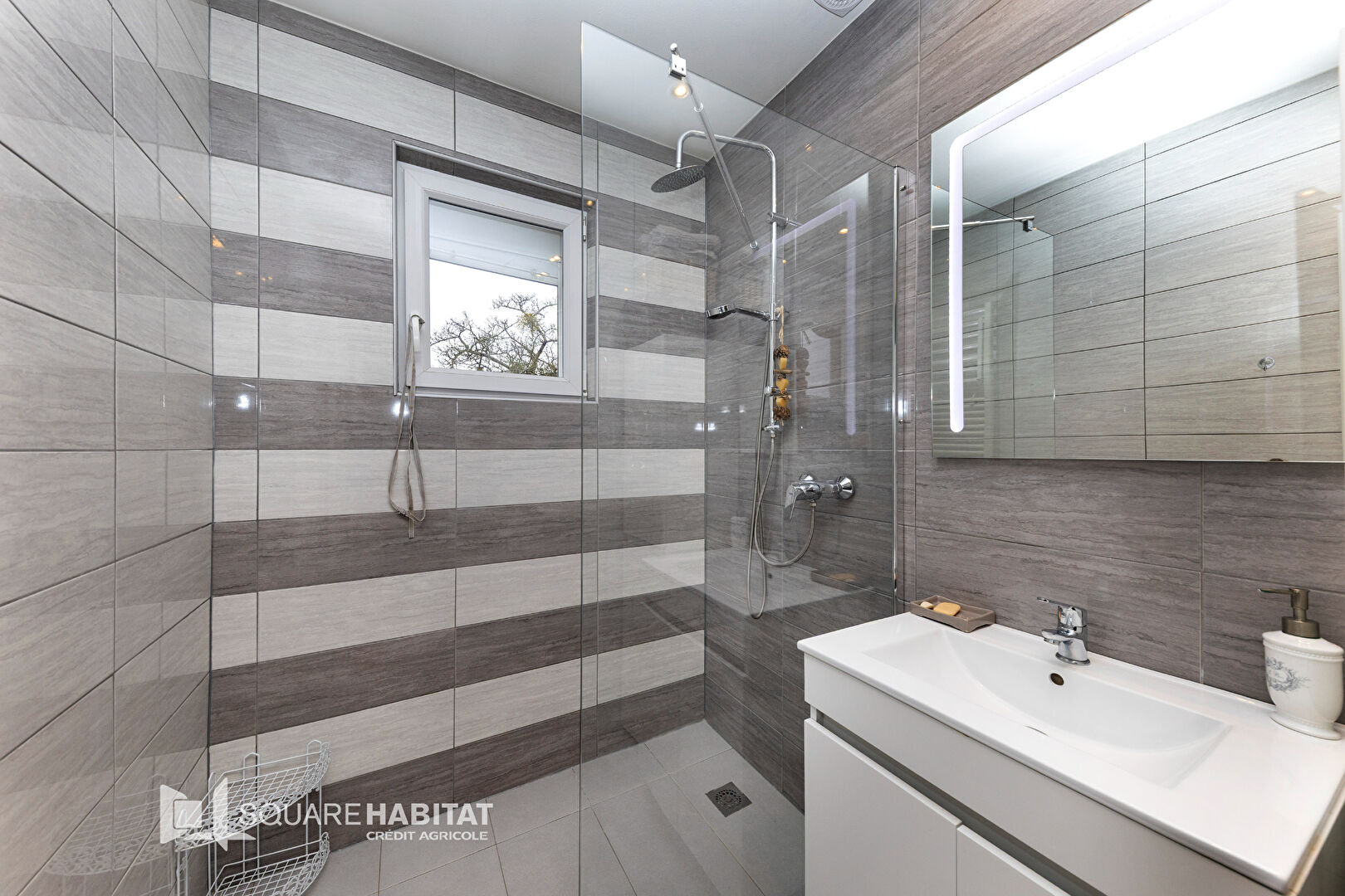 Une salle d'eau moderne et un WC séparé.