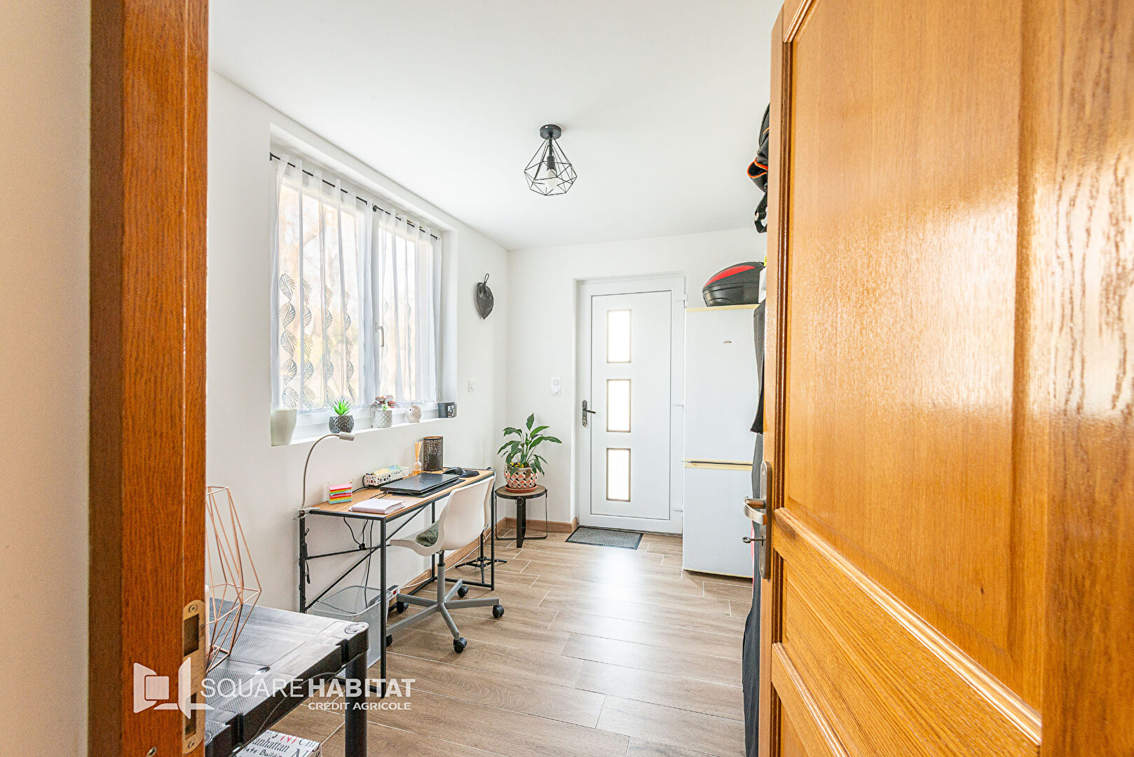 Elle offre un vaste salon séjour avec feu à pellet, une cuisiné équipée, un couloir avec bureau, un local technique, une salle de bains et une suite parentale avec salle de douche et vasque.