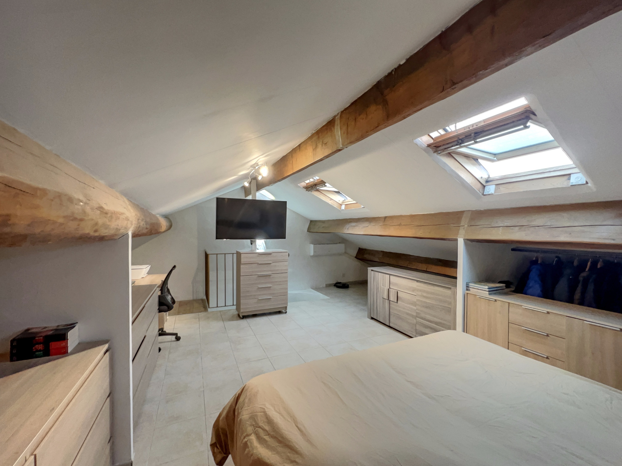Appartement T2 situé au premier étage à Quissac. Composé d'un séjour avec coin cuisine amenagée, d'une salle d'eau avec double vasque et emplacement lave linge, d'un WC séparé. Au second, sous les combles, une grande chambre avec deux velux (ouverture automatique avec capteur de pluie et volet roulant solaire. Appartement en bon état, les équipements sont récents et de qualité. Une terrasse permet d'avoir un espace extérieur au même niveau que le séjour/cuisine. La cour est exposée Est et dispose d'une grande terrasse couverte et sécurisé avec un coin cuisine d'été. Idéal pour profiter d'un extérieur en été. Possibilité de remettre une chaudière à gaz, les radiateurs et le réseau n'ont pas été déposé.