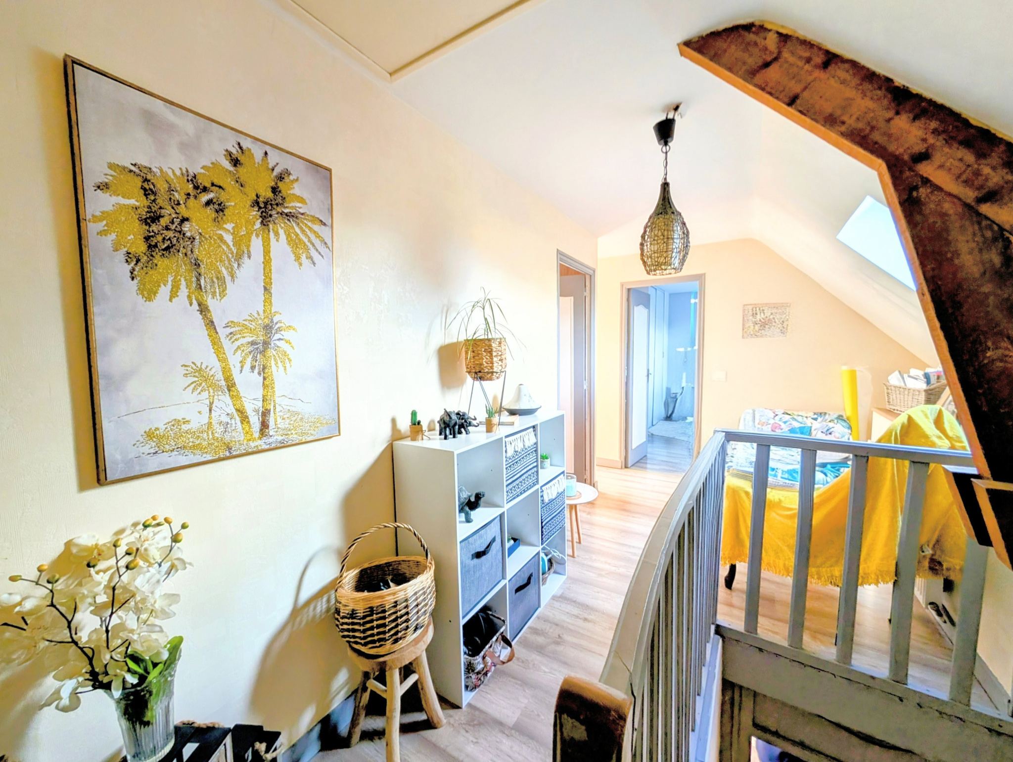 La maison offre une distribution optimisée avec au rez-de-chaussée une cuisine aménagée ouverte sur un salon-séjour lumineux. Le séjour est équipé d'un poêle à bois performant et se poursuit vers une salle d'eau et un WC indépendant. À l'étage, vous disposerez d'un palier desservant trois chambres confortables avec placard, offrant un espace nuit calme et bien séparé.