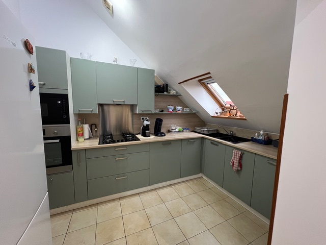 A l' étage : un palier avec vestiaire, un séjour plein sud de 30m2 avec grand balcon, une cuisine équipée neuve, une salle de douches neuve, 2 chambres et un bureau