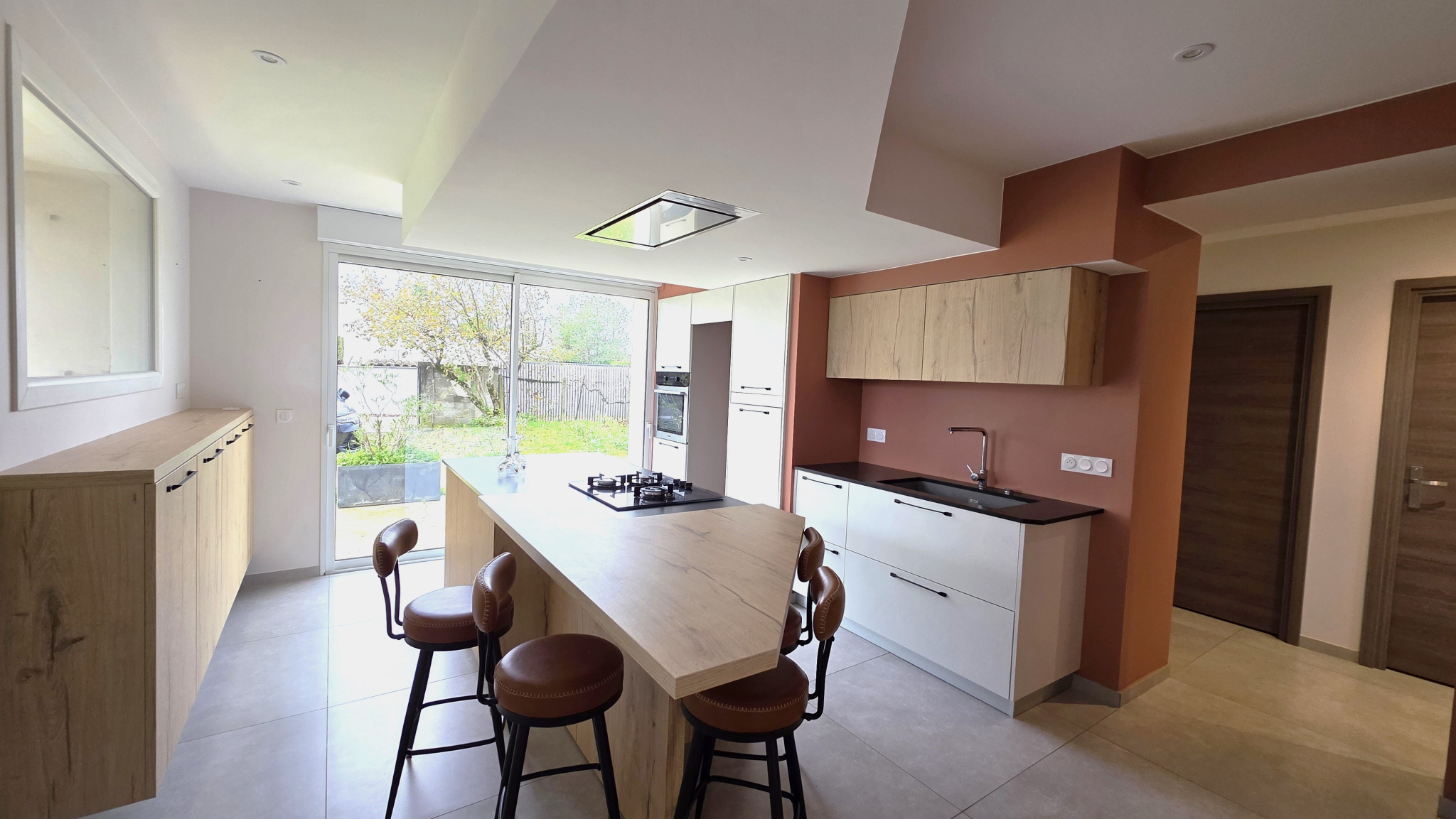 En rez-de-chaussée vous disposerez d'un grand hall offrant un accès à la cuisine (Roche) entièrement équipée, une grande pièce de vie de 47m2, une chaufferie, une salle d'eau avec WC et de nombreux rangements.