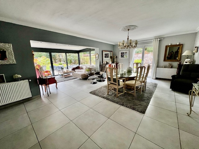 Cet espace de réception lumineux est sublimé par une véranda offrant une vue dégagée sur le jardin arboré, parfaitement exposé sud-ouest, garantissant luminosité et ensoleillement tout au long de la journée.