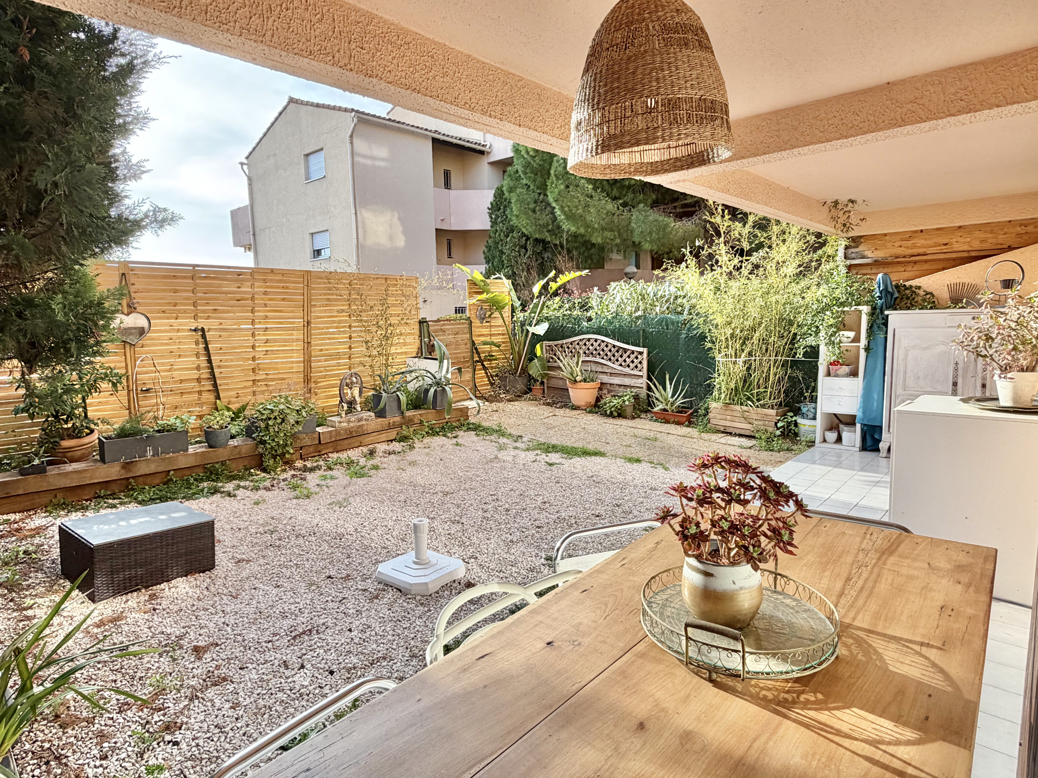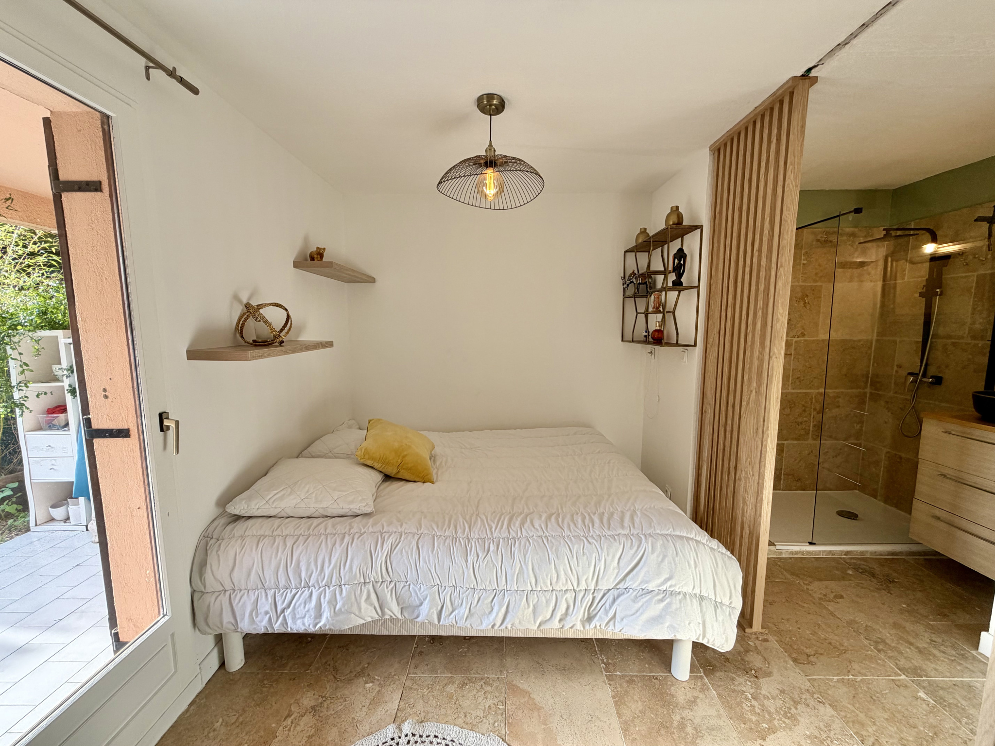 Vous bénéficiez d'une entrée privative sur un jardin privatif de 37m2 et d'une terrasse couverte. Vous entrez dans une pièce de vie ouverte avec une cuisine entièrement équipée et meublée. Dans la continuité, on retrouve des Wc indépendants ainsi qu'une chambre avec accès sur l'extérieur, son dressing et sa salle d'eau.