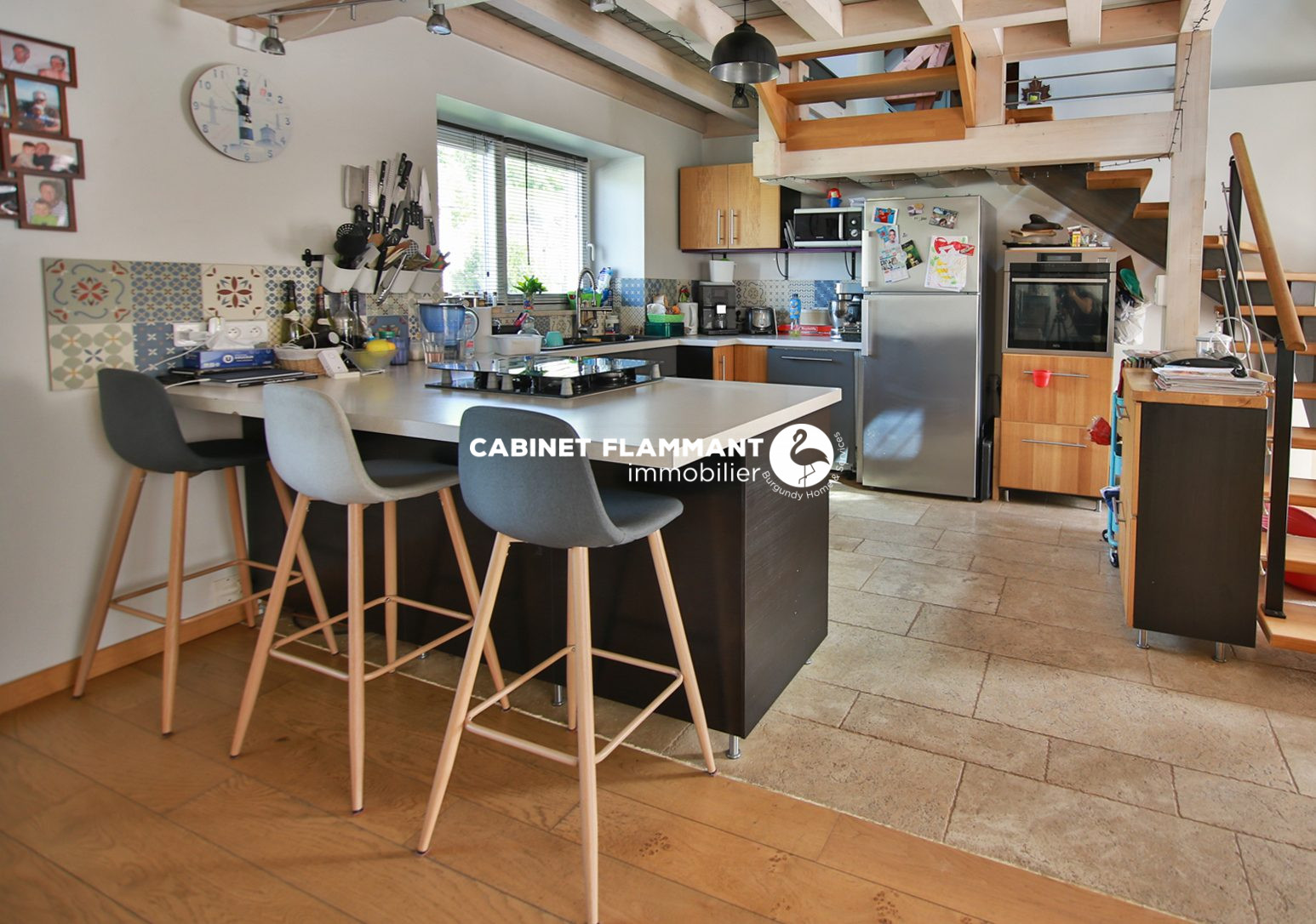 Le tout sublimé par des matériaux nobles tels que la pierre de Bourgogne et du beau parquet, apportant du cachet à l'ensemble.