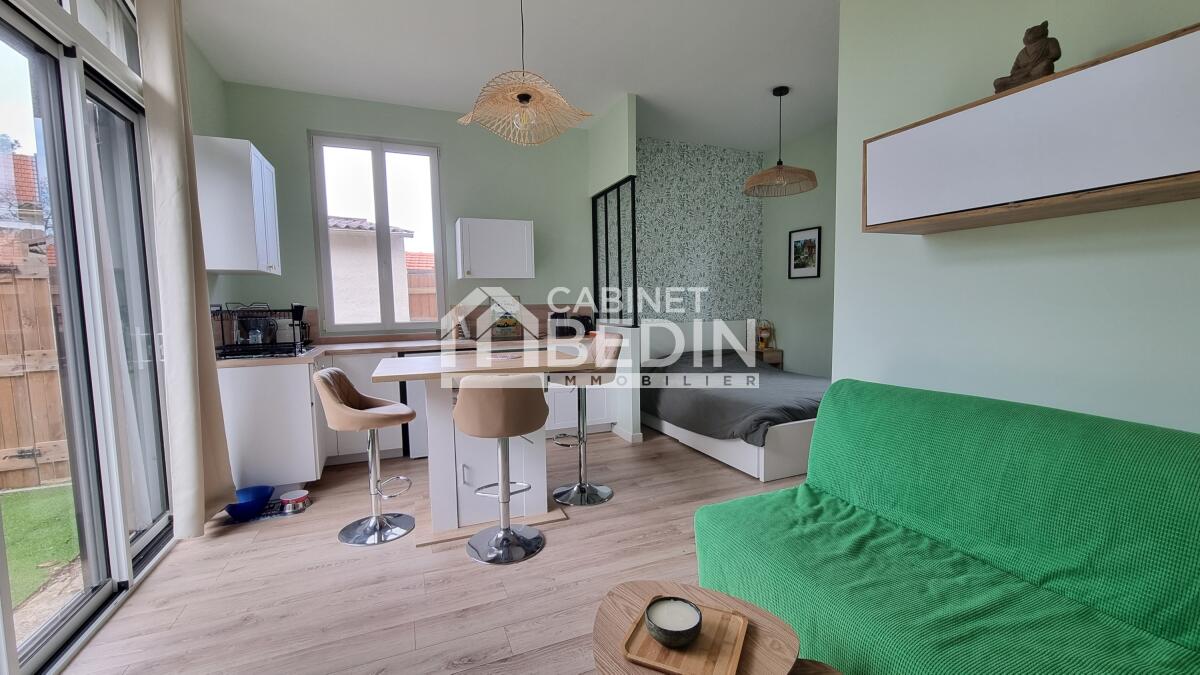 Exclusivité CABINET BEDIN - Arcachon ville hiver studio avec terrasse. En exclusivité, emplacement d?exception ? Ville d?Hiver, Arcachon. Situé au c?ur du quartier emblématique de la Ville d?Hiver, à quelques pas du Parc Mauresque, ce bien rare prend place au sein d?une petite copropriété confidentielle installée dans une demeure arcachonnaise. En rez-de-jardin, ce studio entièrement rénové avec des prestations soignées offre une superbe luminosité et un agencement parfaitement optimisé : une agréable pièce de vie ouverte sur une terrasse plein sud, un espace nuit aménagé, une salle d?eau contemporaine, ainsi qu?un grand cellier sur le même niveau, véritable atout de confort et de rangement. À l?extérieur, vous profiterez d?une terrasse clôturée, sans vis-à-vis, idéale pour des moments de détente en toute tranquillité. Un stationnement complète ce bien, un avantage rare dans ce secteur prisé.