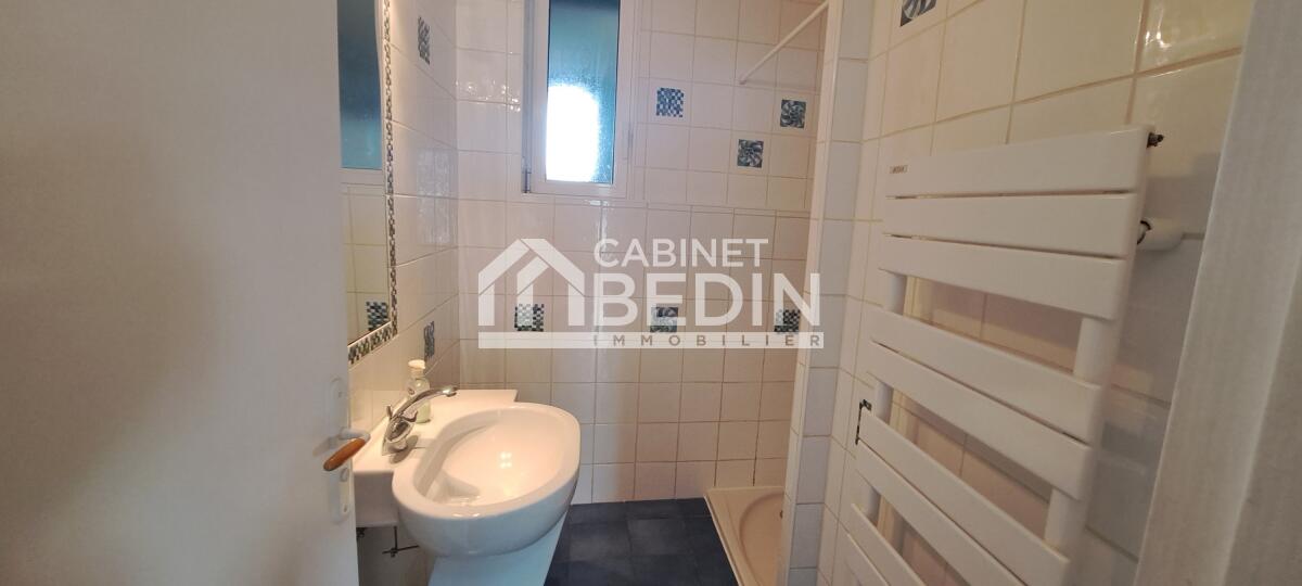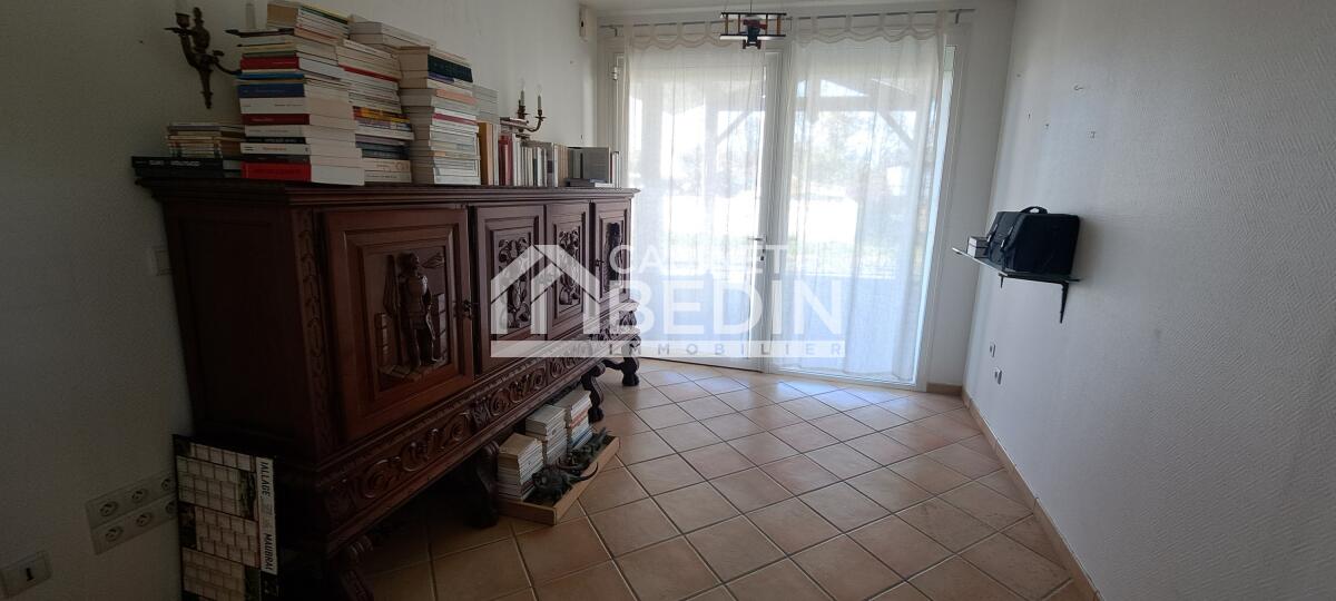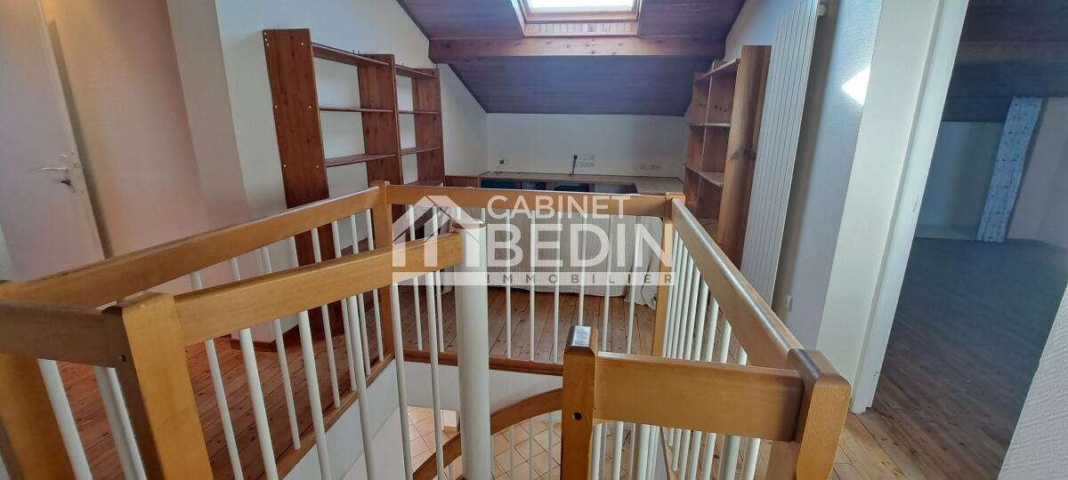 À l'étage : 2 chambres, une salle de bains et un palier mezzanine de 19 m² pouvant servir de bureau.