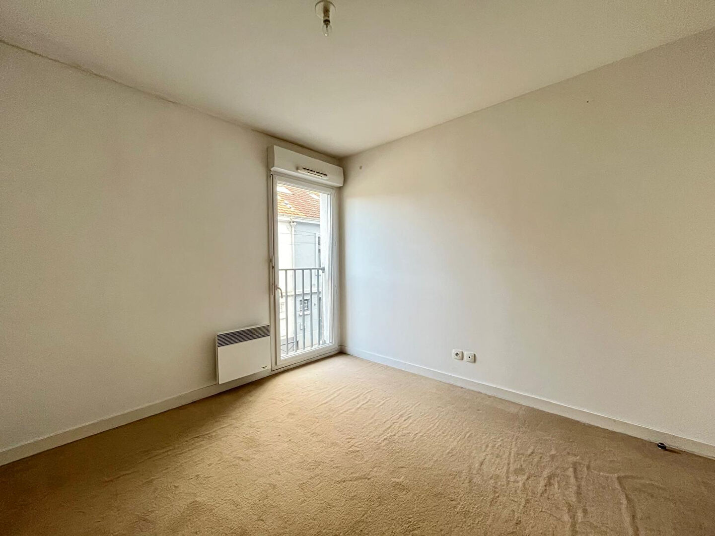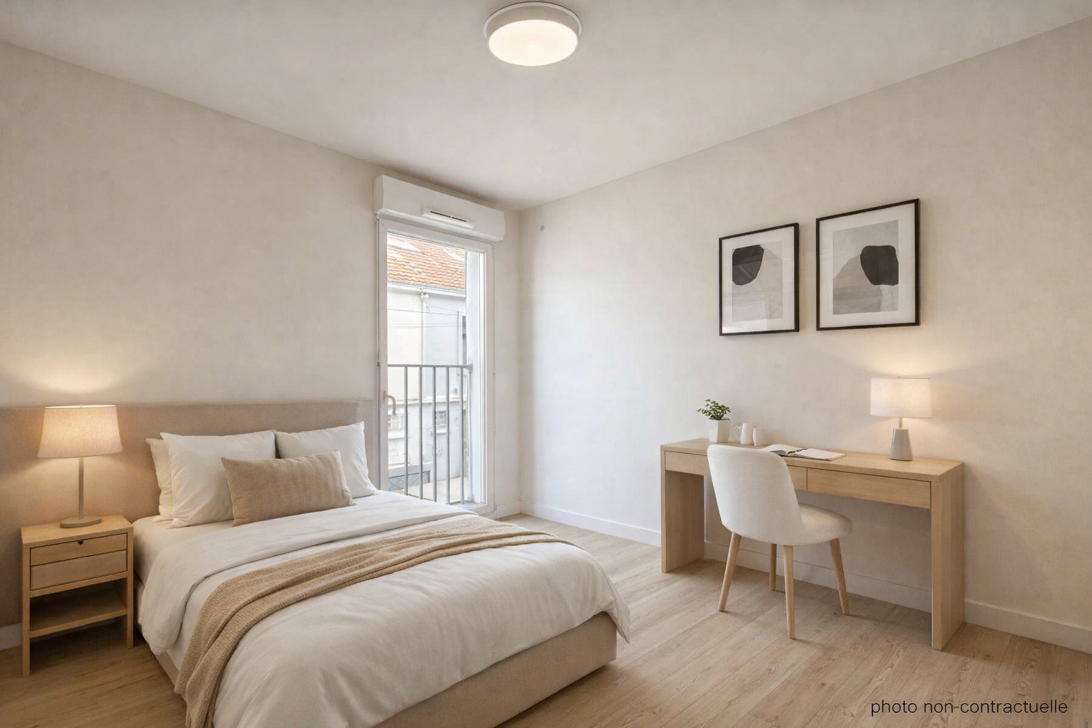 Entrée avec placard, salon/salle à manger lumineux donnant sur l'arrière de la copropriété, deux chambres avec rangements, une salle de bains et WC.