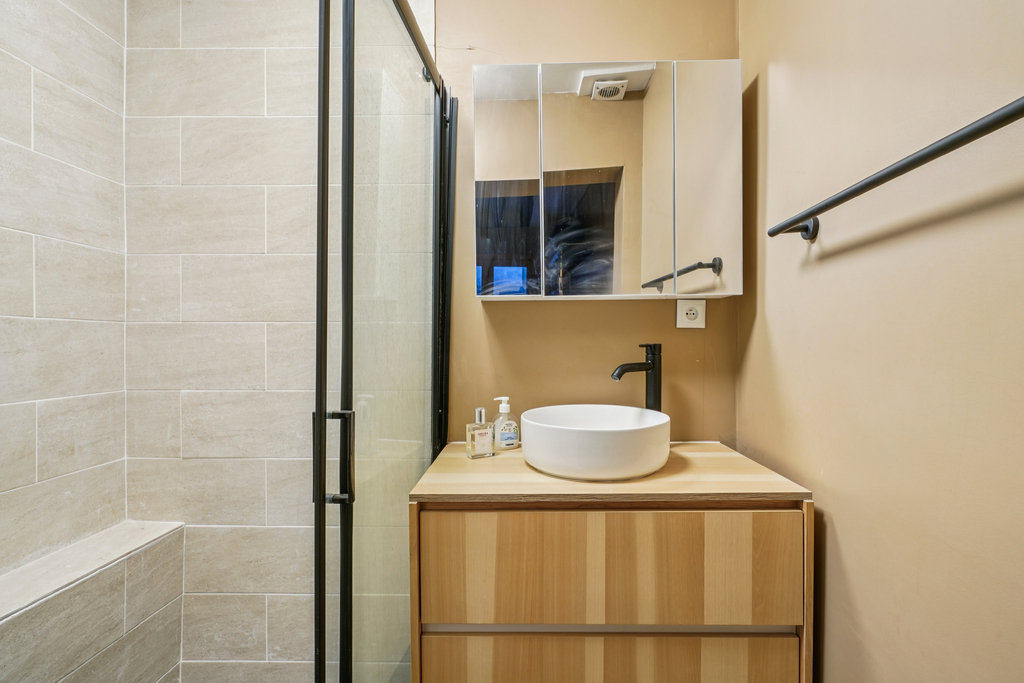 L'appartement comprend une entrée avec un petit couloir s'ouvrant sur un séjour lumineux et sa cuisine ouverte, d'une chambre donnant sur une petite cour avec sa propre salle de douche et un WC séparé.