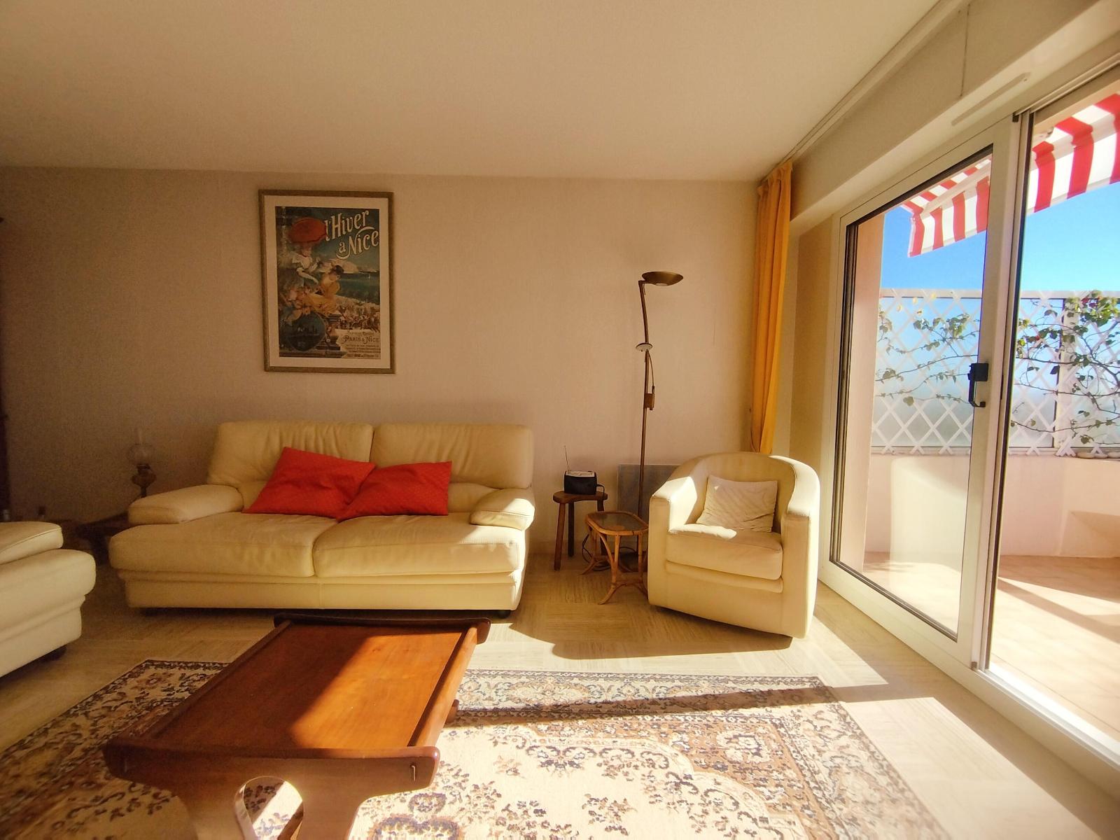 . Belle distribution pour cet appartement avec notamment un séjour de 28m² + cuisine aménagée de 9m², les 2 pièces donnant accès à une belle terrasse tournée vers la Mer et le Cap d'Antibes. Sur l'arrière de l'appartement, le coin nuit climatisé, bien séparé de la partie jour avec un vestibule qui dessert 2 belles chambres de 11,5m² avec penderie pour chacune. Salle d'eau avec WC et un second WC indépendant.