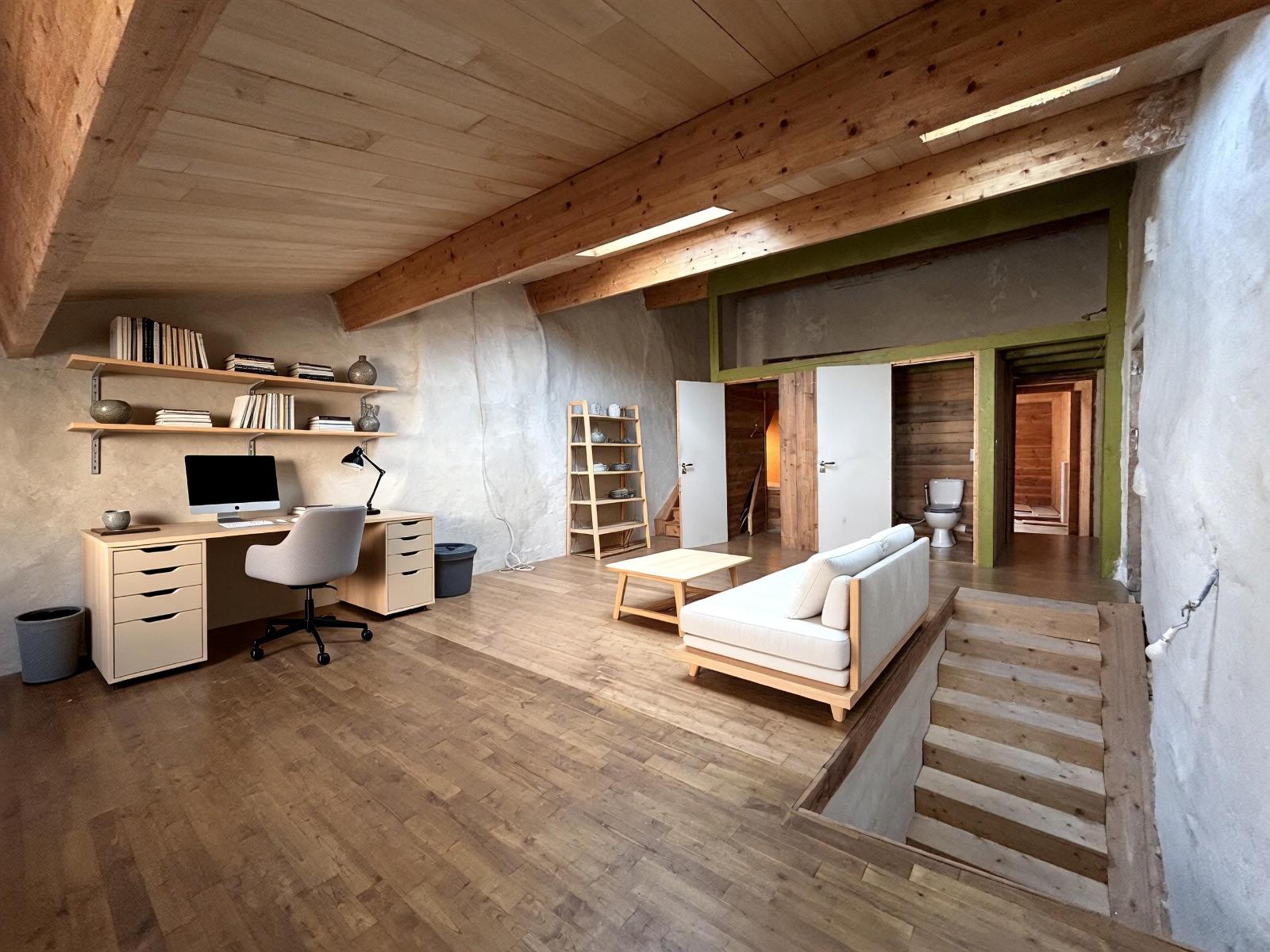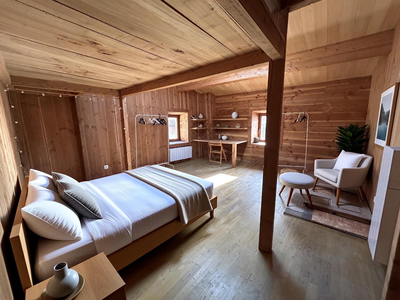 Au deuxième étage, le plafond a été entièrement rénové. Les murs ont été partiellement rénovés avec la mise en place d'un doublage bois et d'un isolant.