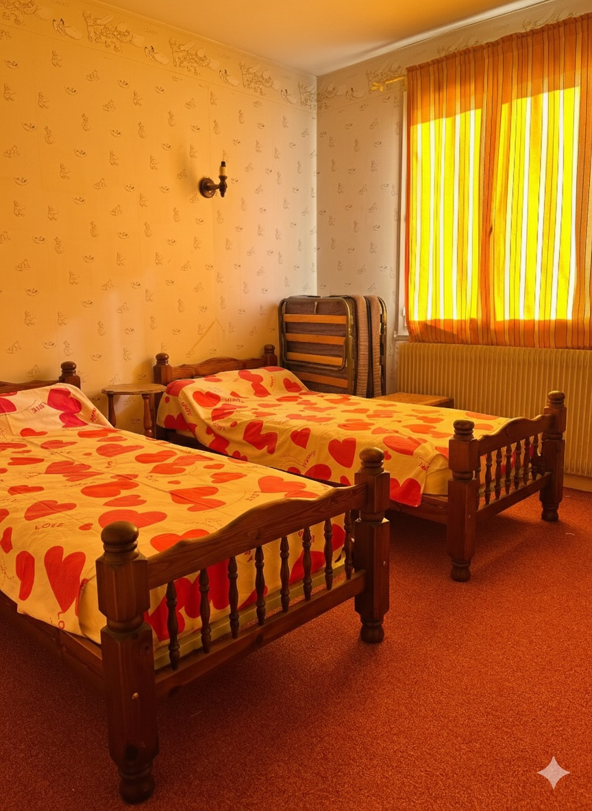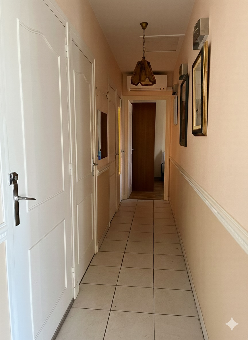 Couloir desservant trois chambres, une salle de bain (baignoire) et un WC séparé