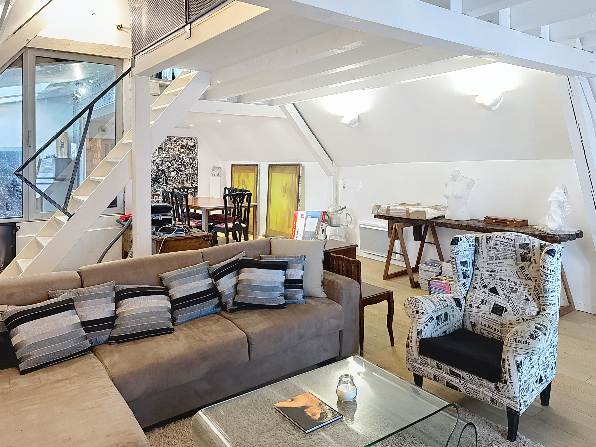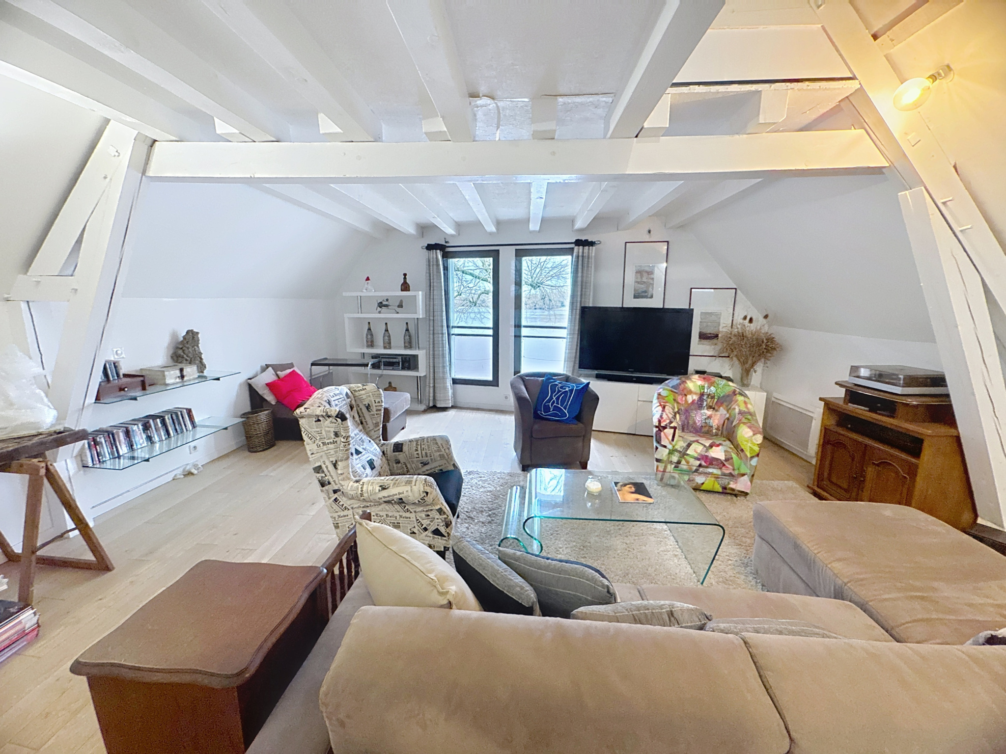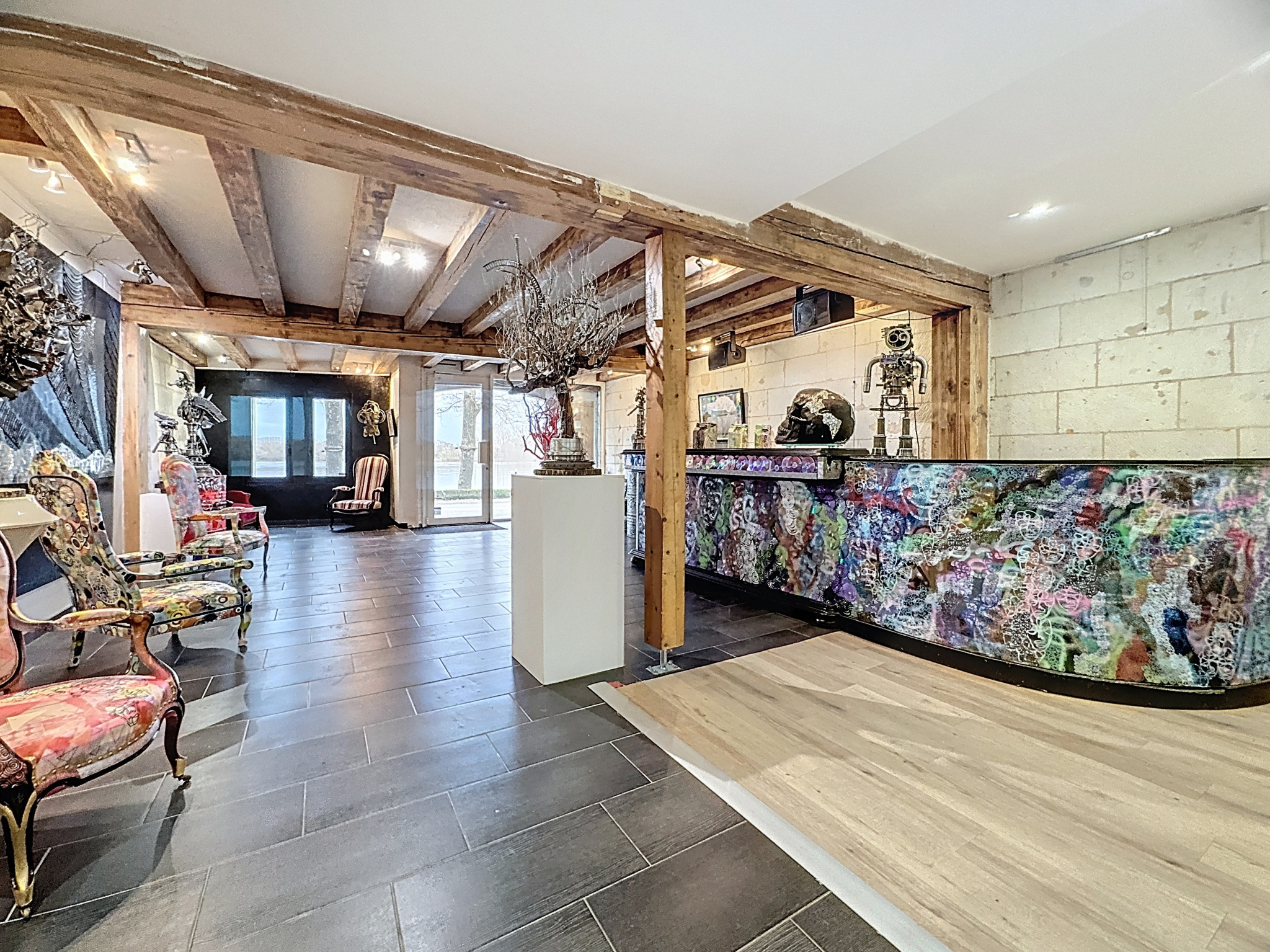 Maison d'artiste située à Montsoreau en bord de Loire près de Saumur, aménagée dans une ancienne fabrique de bateaux du XVIIe siècle, elle possède un salon-atelier de 65 m2 avec un bar et un duplex à l'étage donnant beaucoup d'originalité.