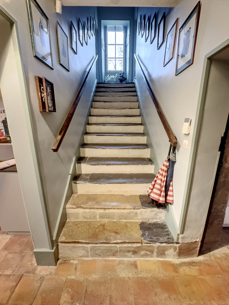 LE MANOIR (chauffage électrique & Poêle à bois) environ 400 m2 Rez-de-Chaussée : pièces traversantes - sol sur tomettes 2,50 m sous poutres Entrée avec escalier no1 en pierre et ardoise Cuisine 27 m2 (pierre d'évier, cheminée monumentale), ancien garde-manger 6 m2 et réserve sous l'escalier (compteur EDF et ballon électrique) Salle à manger traversante de 36 m2 (tomeetes, meur en pierre de tuffeau) Salon traversant no2 de 37 m2 (poutres, cheminée) Bureau 13 m2 avec entrée arrière, escalier no2 en chêne et WC Chambre 1 de 16 m2 avec salle d'eau Entrée sur un 3o escalier rejoignant les greniers sur tomettes sur environ 20 m de long.