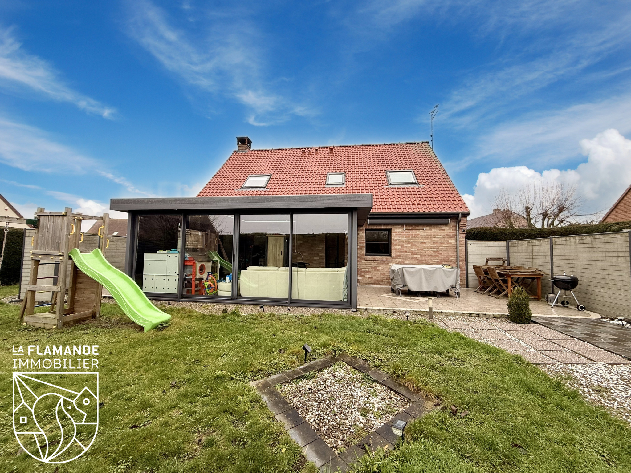Cette maison individuelle construite en 2004 par Maisons d'en Flandre offre une surface habitable de 125 m2 (incluant la véranda de 20m2).