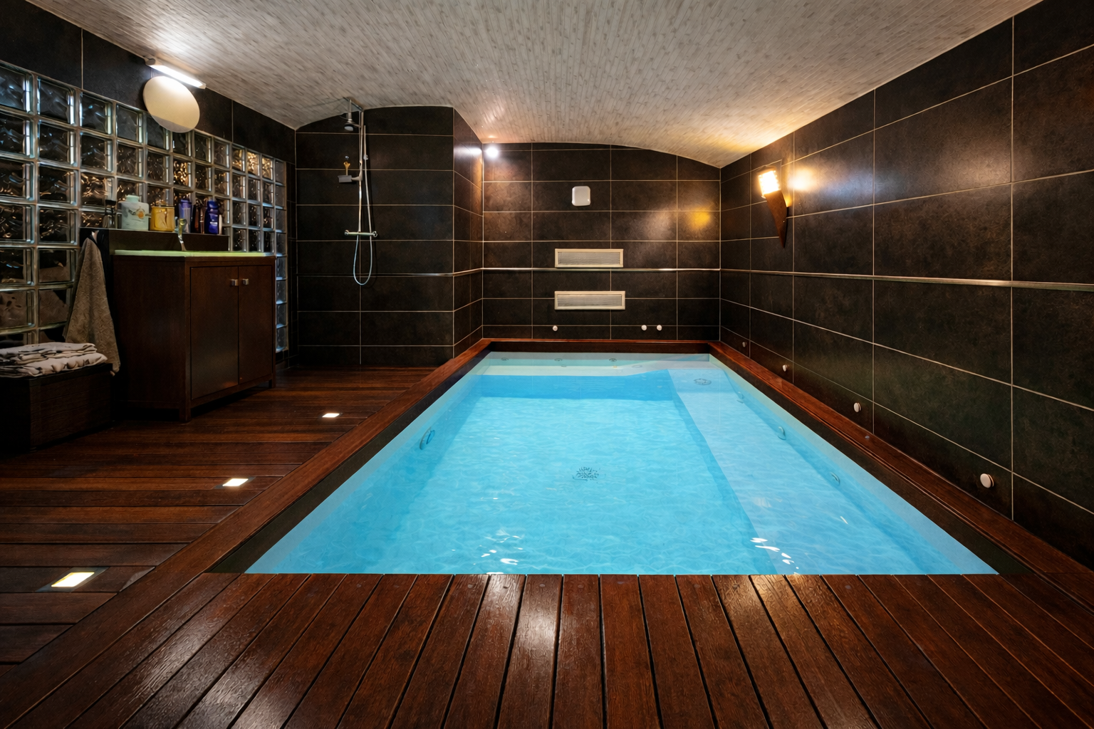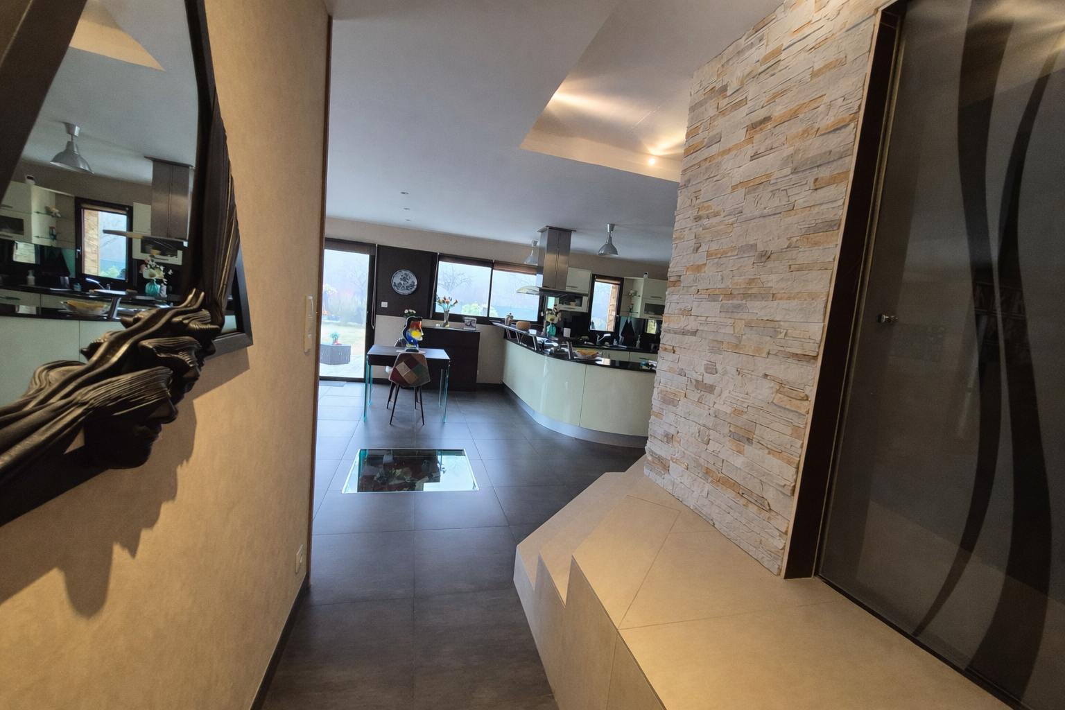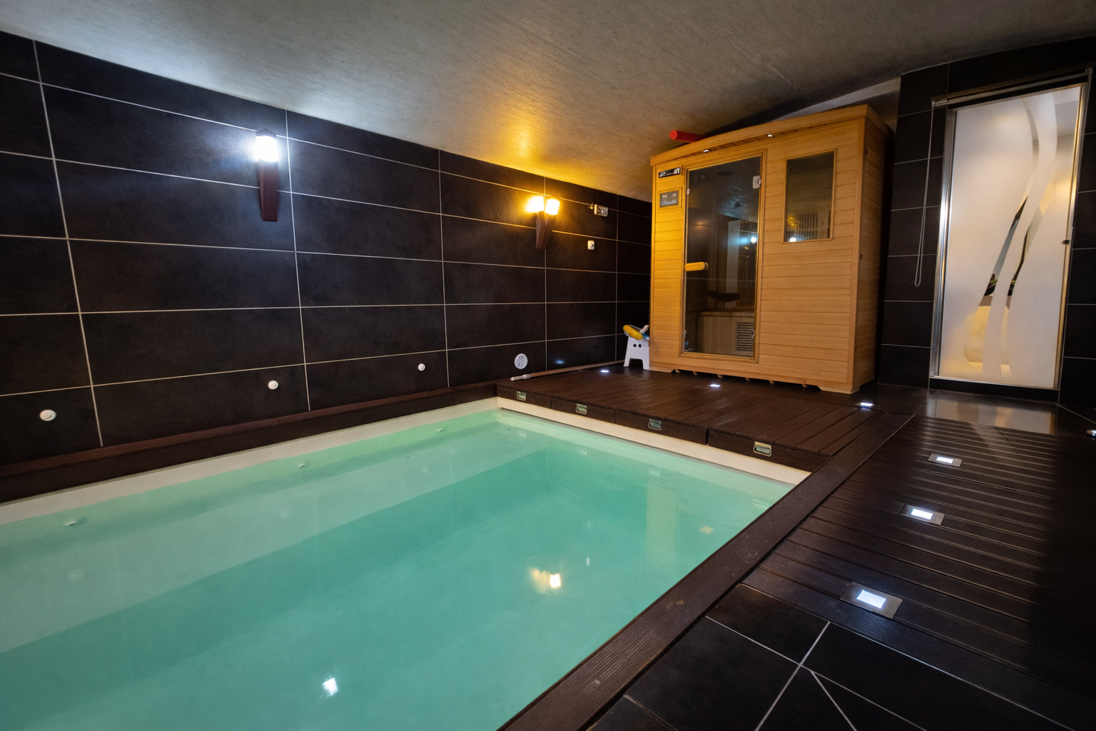 Elle se compose au rez-de-chaussée d'un grand séjour lumineux avec cuisine ouverte, d'une suite parentale avec dressing et salle de bains, d'un WC indépendant et d'un espace bien-être avec piscine intérieure chauffée et sauna.
