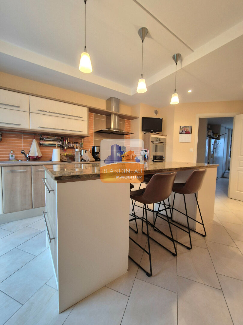 La cuisine aménagée et équipée, dotée d'un îlot central, offre un espace convivial et fonctionnel, complété par une arrière-cuisine / buanderie.