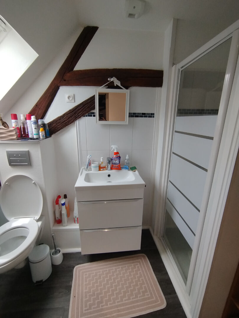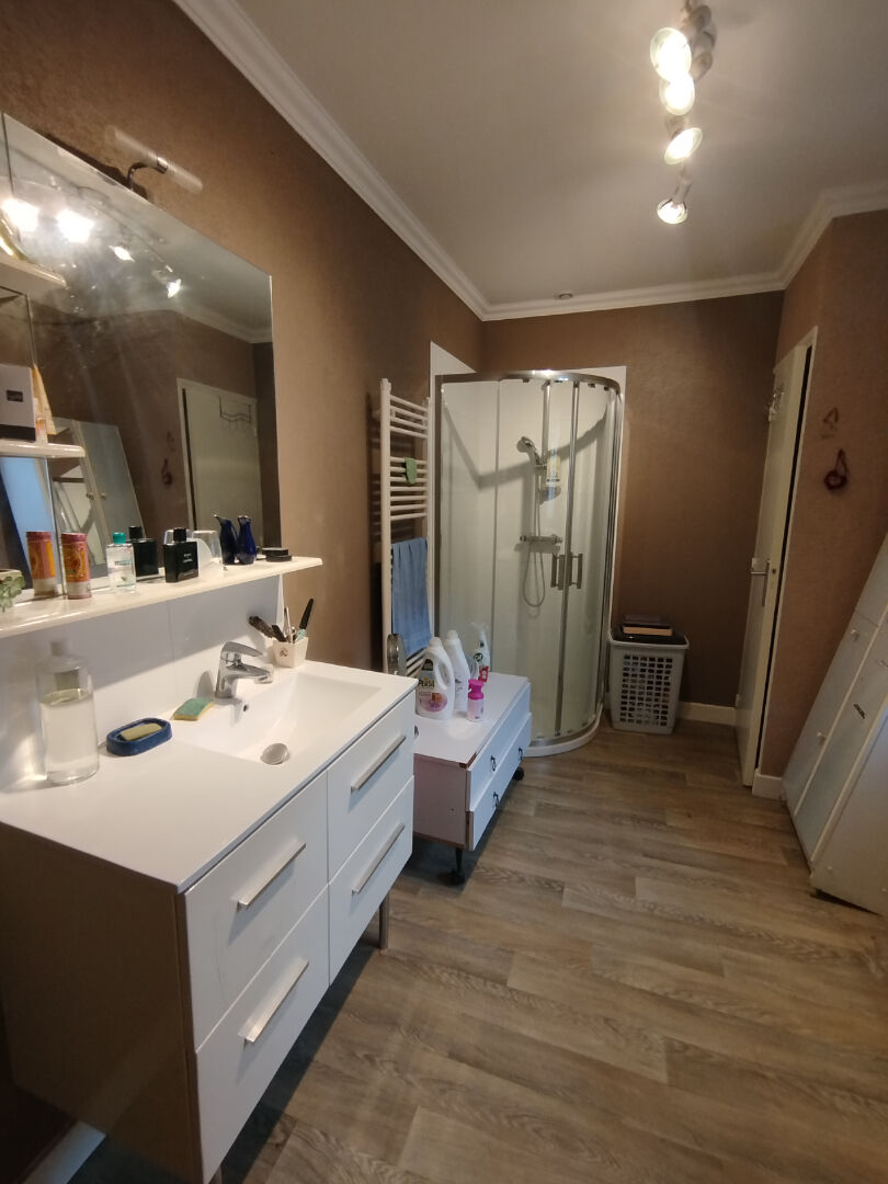 À l'étage, un palier avec rangements dessert une vaste mezzanine offrant nombre de possibilités d'aménagement. Vous trouverez également un dégagement conduisant à une salle d'eau avec WC, un bureau ainsi qu'une chambre.