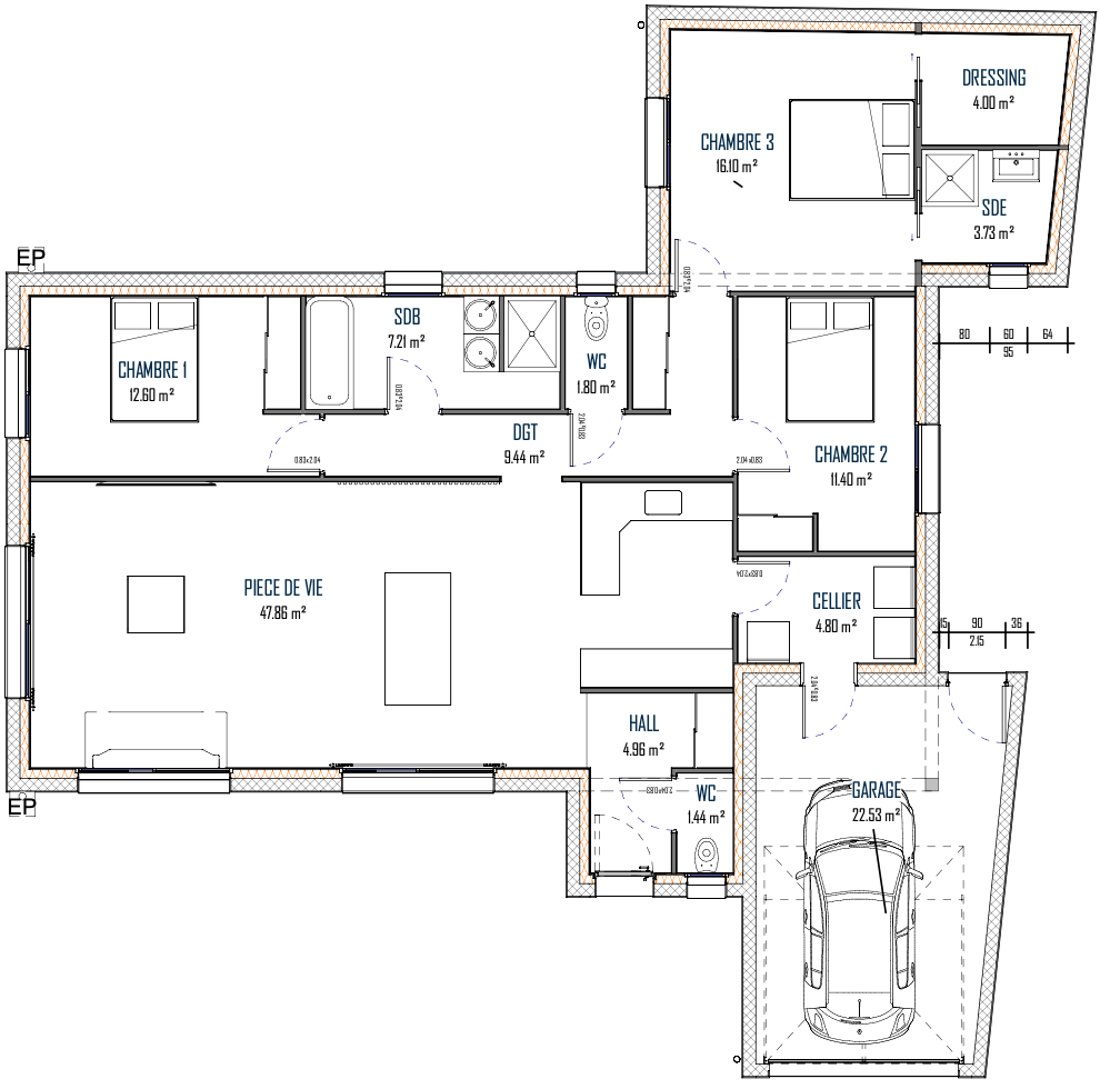 Suggestion de plan pour une maison de plain pied de 125m2 à ajuster selon votre projet.