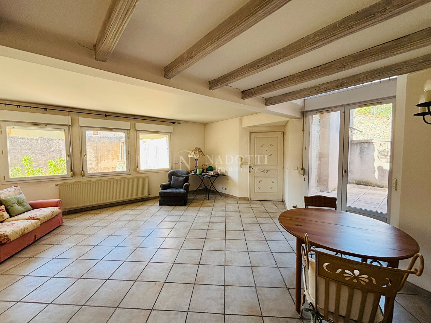 Un grand salon lumineux s'ouvre sur une terrasse avec vue imprenable sur la colline Saint Jacques, La cuisine, aménagée équipée est attenante à la pièce de vie.