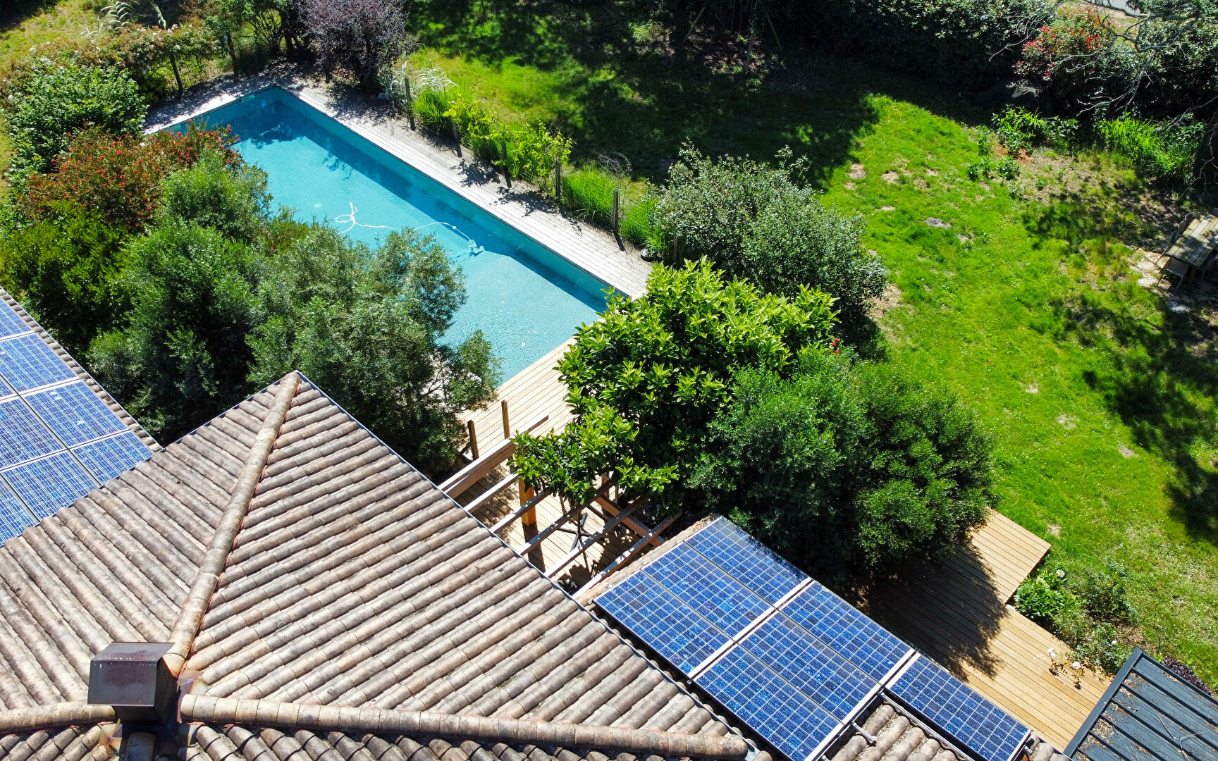 Côté extérieur: d'agréables terrasses en bois permettent de profiter de la nature environnante et du jardin arboré, tout comme la piscine au sel de 15m x 4.5m exposée plein sud. Garage et carport.