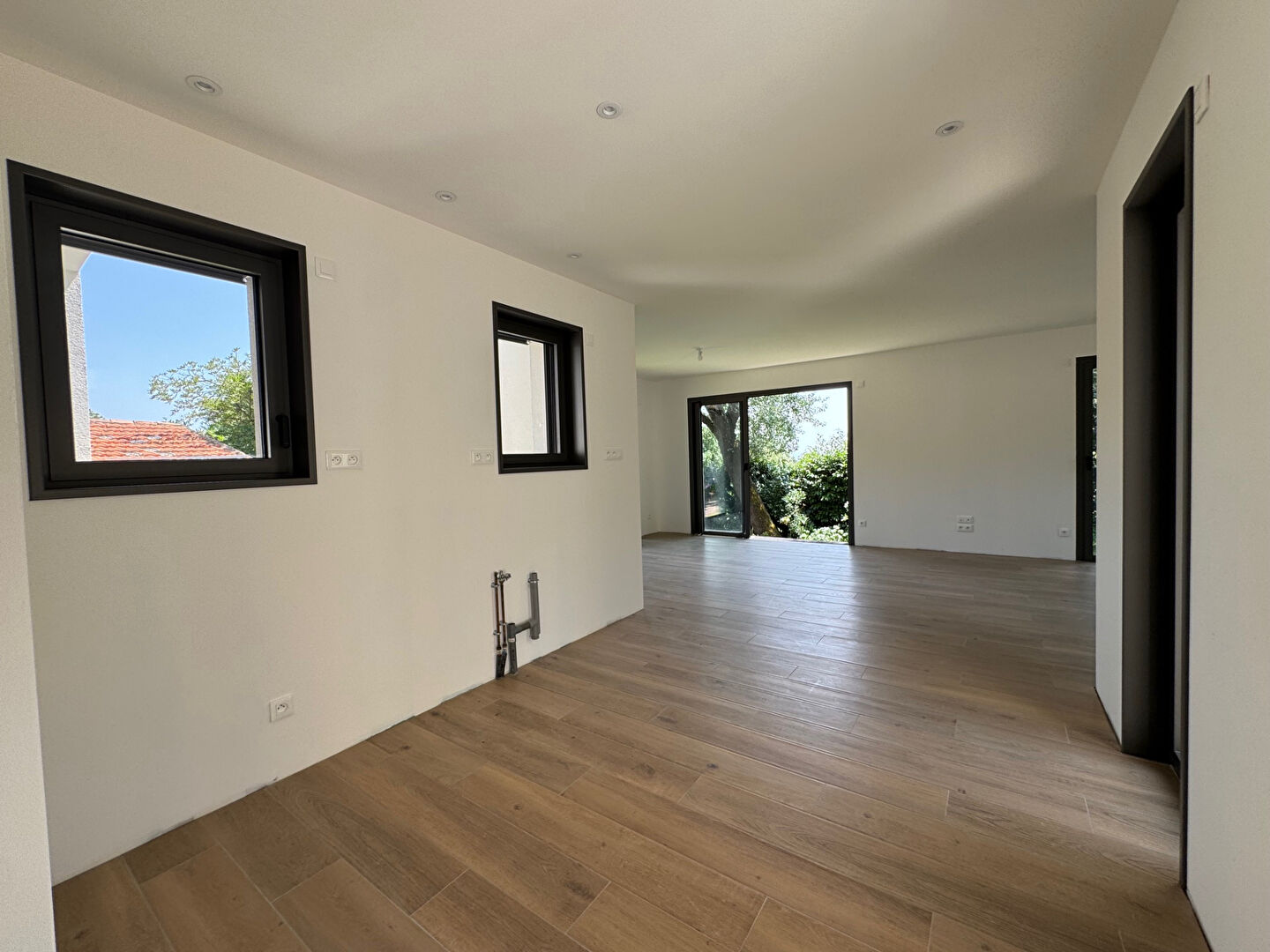 Une entrée, une cuisine ouverte, et une pièce de vie principale avec vue sur la mer donnant accès sur une future terrasse bois, une suite parentale au rez-de-chaussée.