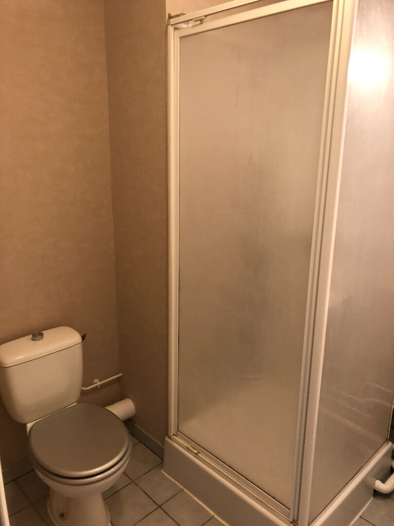 Studio au 1er étage d'un immeuble composé de 2 étages - Entrée directe sur une kitchenette - pièce principale avec rangement et vue sur espaces verts - salle d'eau avec douche, lavabo et wc - parking en sous-sol