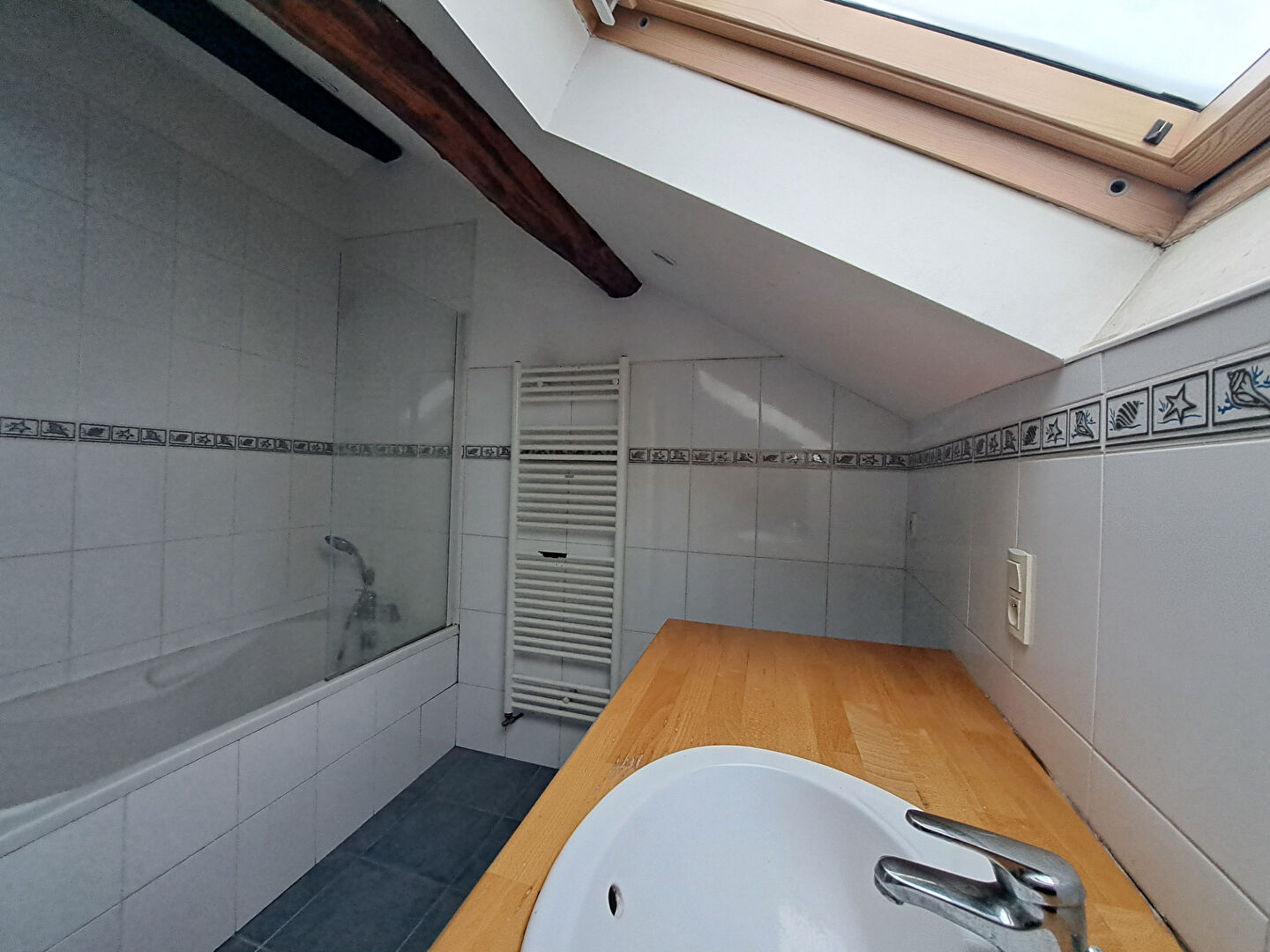À l'étage en sous pente, un espace de rangement, un coin bureau et une salle de bains complètent l'ensemble, ainsi qu'une grande chambre avec poutres apparentes.