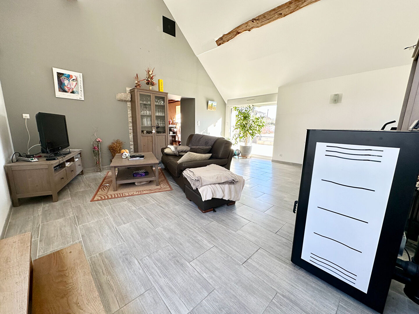 La maison se compose en rez-de-chaussée d'une cuisine aménagée, salon et séjour pour un total de pièce de vie de plus de 70 m², une chambre, et une salle d'eau complète cet espace, ainsi qu'une buanderie et arrière cuisine.
