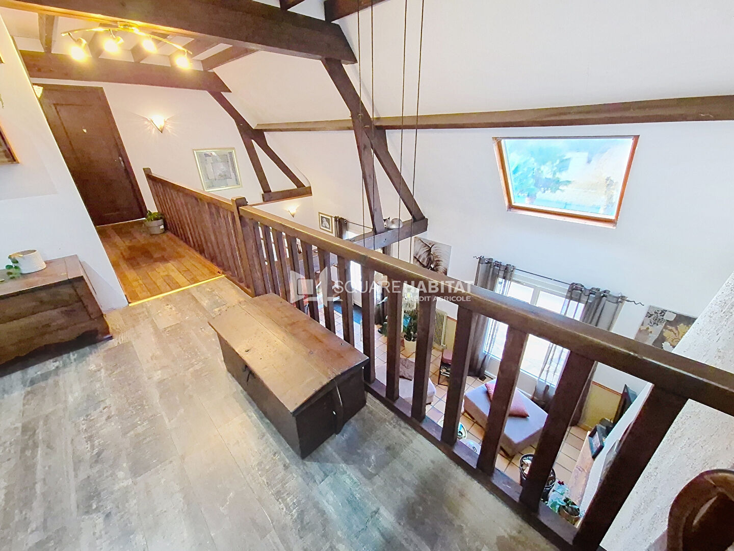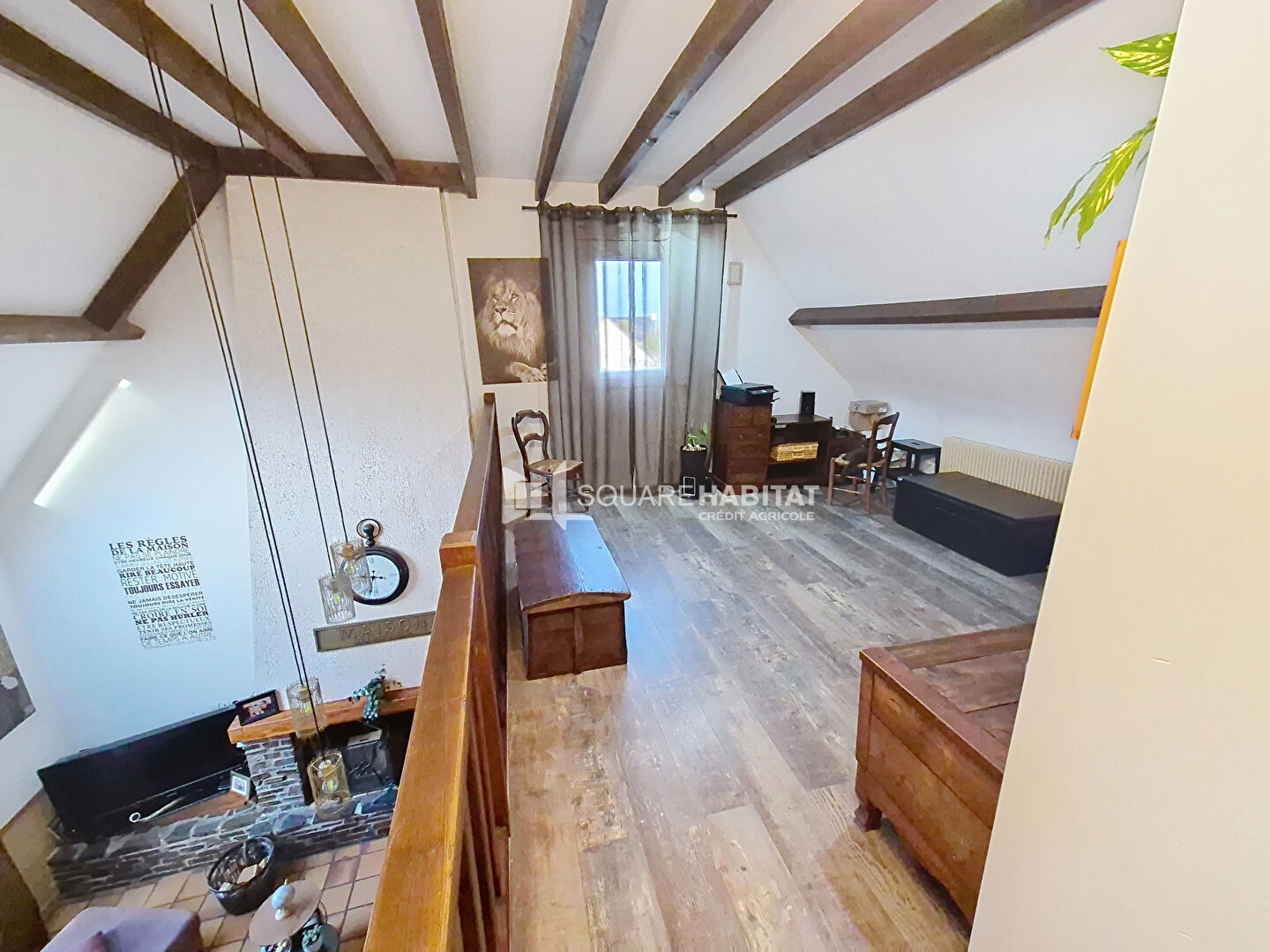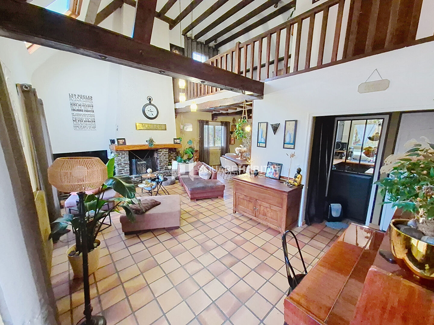 À l'étage, une mezzanine ouverte donnant accès à deux chambres , une salle de d'eau avec WC.