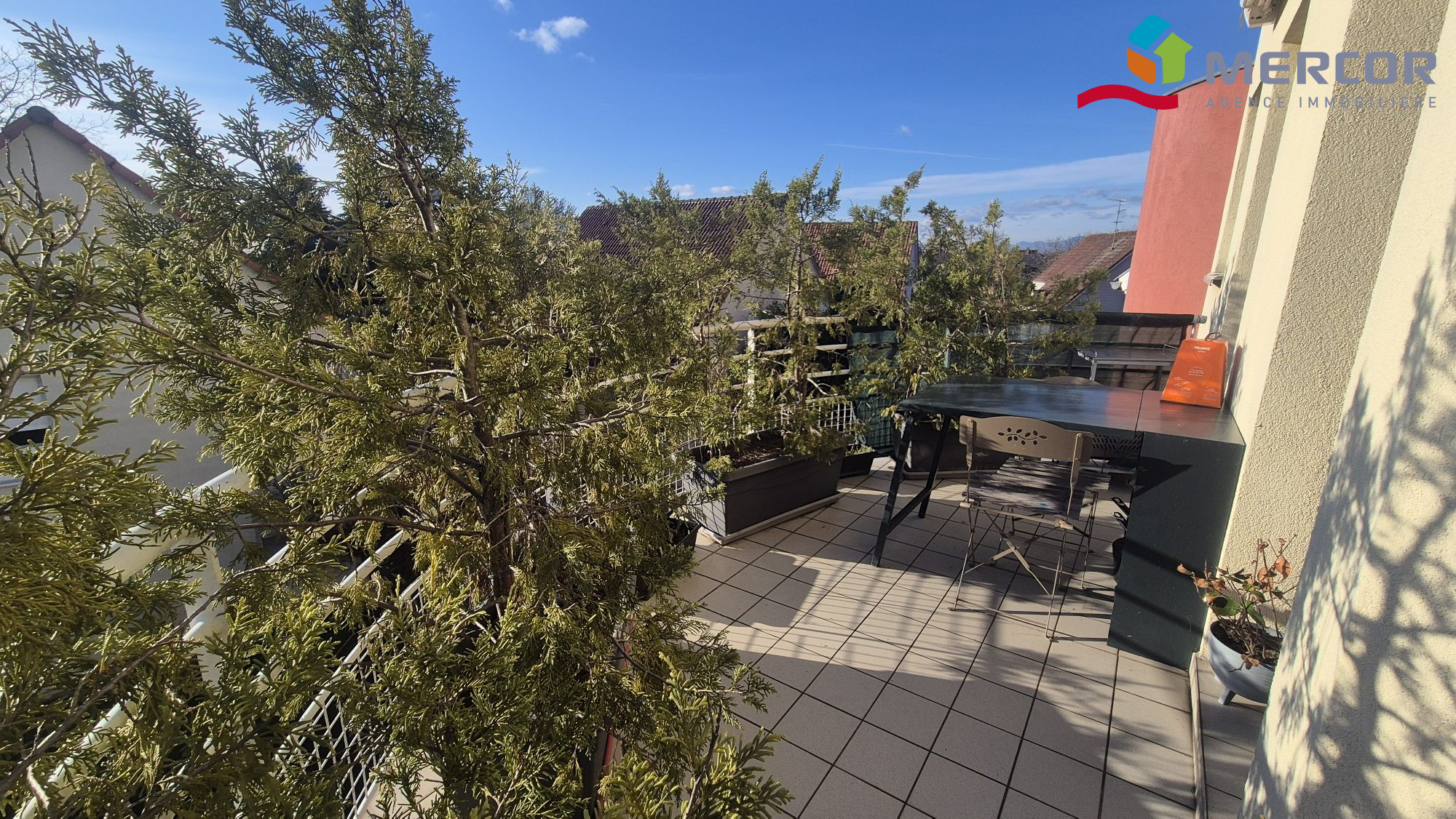 Cet appartement partiellement meublé comprend également une salle de bains, deux WC dont un indépendant, un balcon de 5 m² et une terrasse de 9 m² avec store motorisé, parfaits pour profiter des beaux jours. Deux garages avec portes motorisées et une place extérieure sont également inclus.