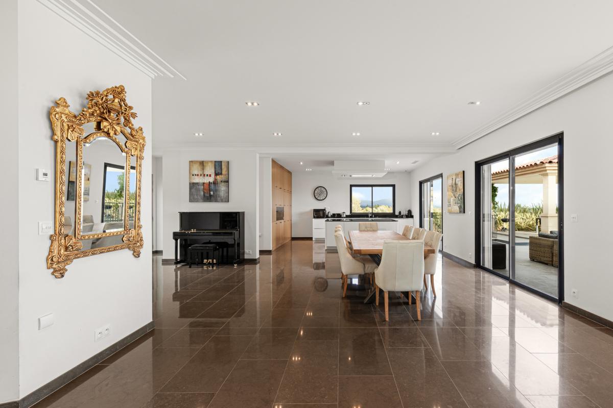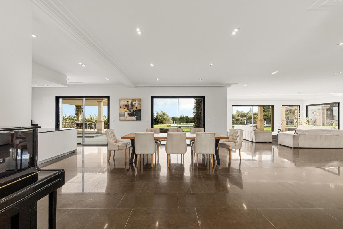 L'espace de vie principal, d'une superficie de plus de 100 m², comprend un vaste salon lumineux, une salle à manger conviviale et une cuisine design entièrement équipée avec arrière cuisine le tout s'ouvrant de plain-pied sur la terrasse, le jardin et la piscine à débordement chauffée.