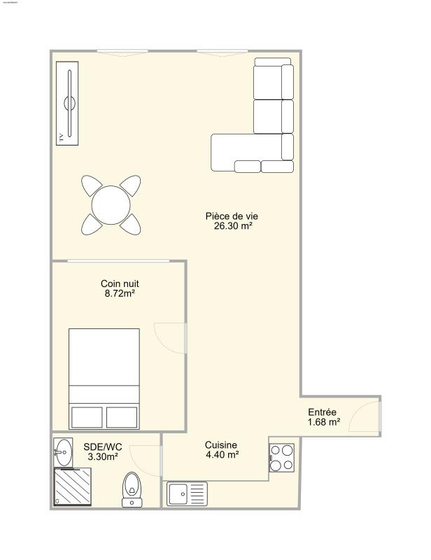 Il se compose d'un beau séjour lumineux, d'une cuisine équipée, d'un coin nuit bien délimité, ainsi que d'une salle d'eau avec WC. L'agencement fonctionnel permet une optimisation parfaite des espaces.