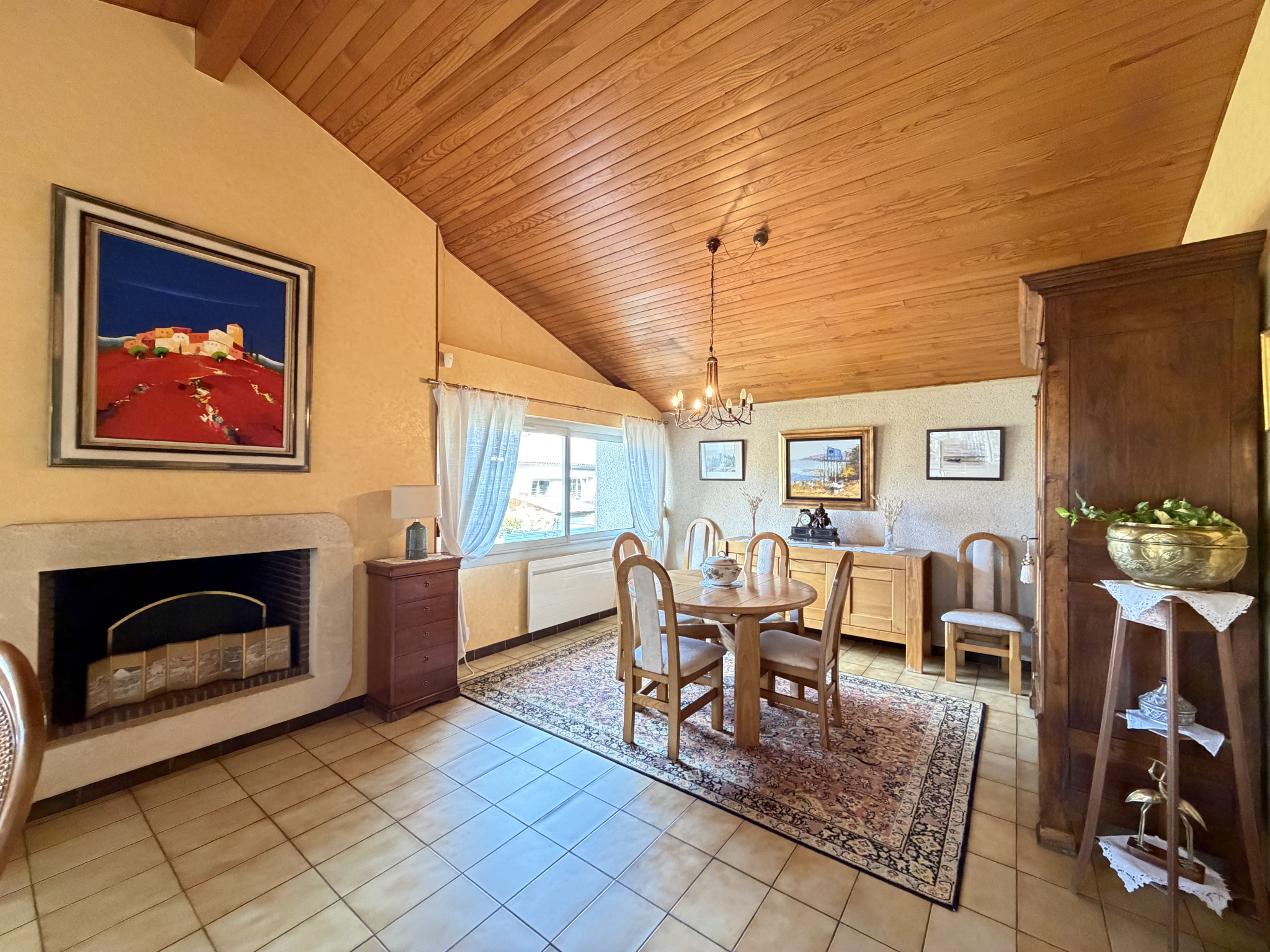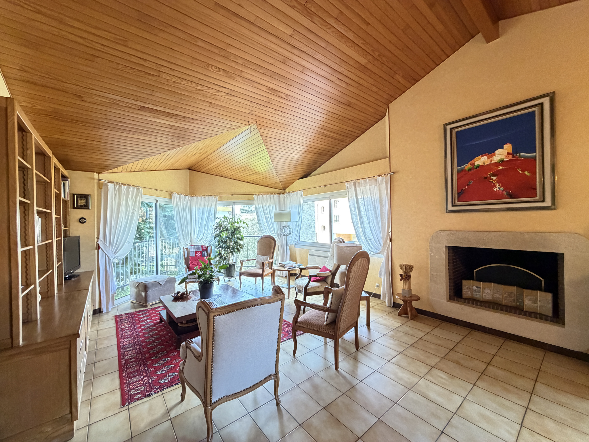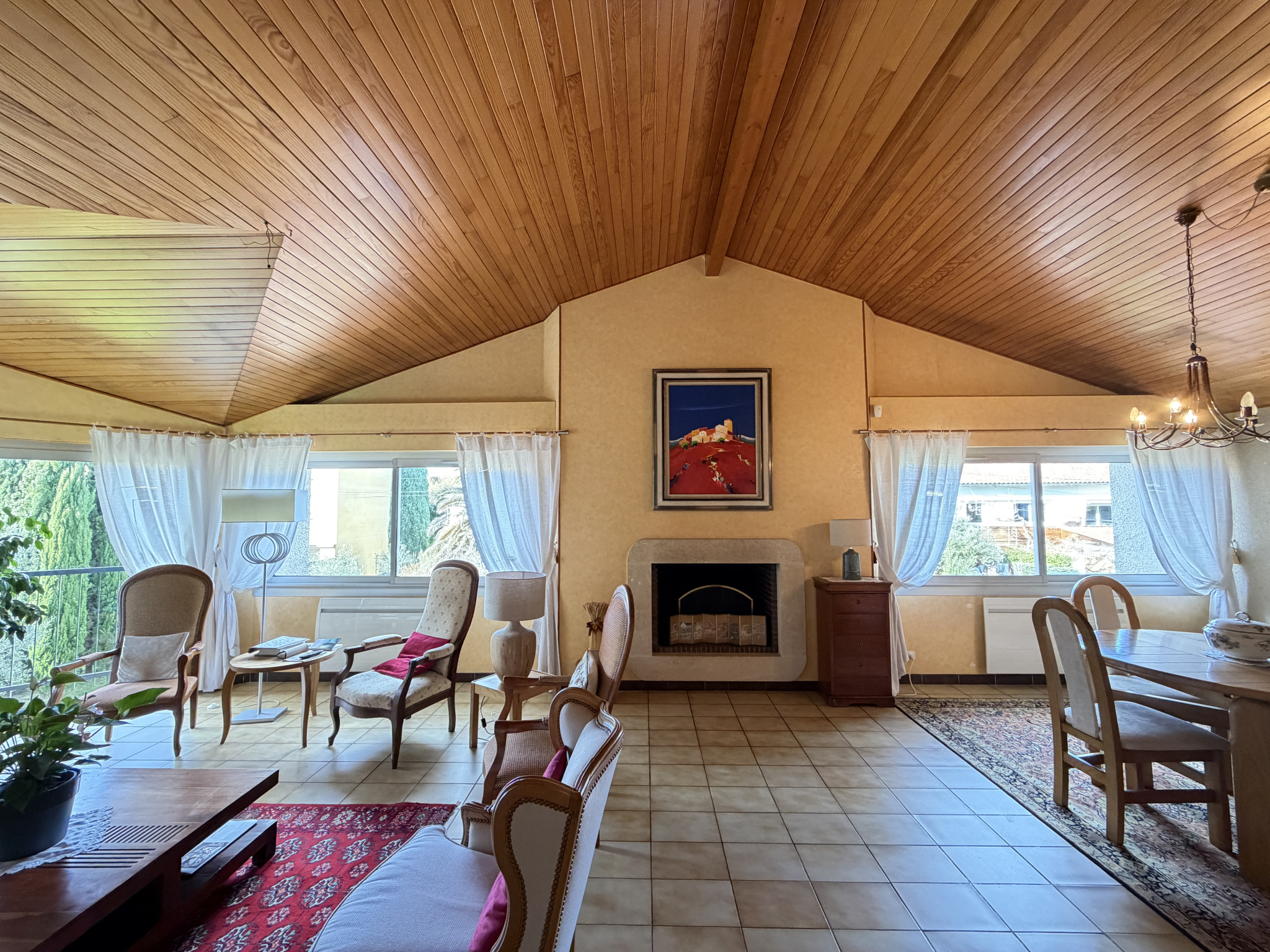 un grand salon-séjour, sublimé par de larges ouvertures et une cheminée, créant une atmosphère chaleureuse et raffinée,