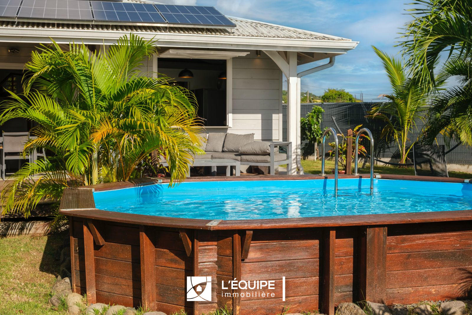 Les extérieurs : Grande terrasse couverte idéale pour les repas et moments de détente Piscine hors sol en bois, parfaitement intégrée à l'environnement Jardin arboré et entretenu, ambiance tropicale avec abri de jardin Coin détente et solarium autour de la piscine