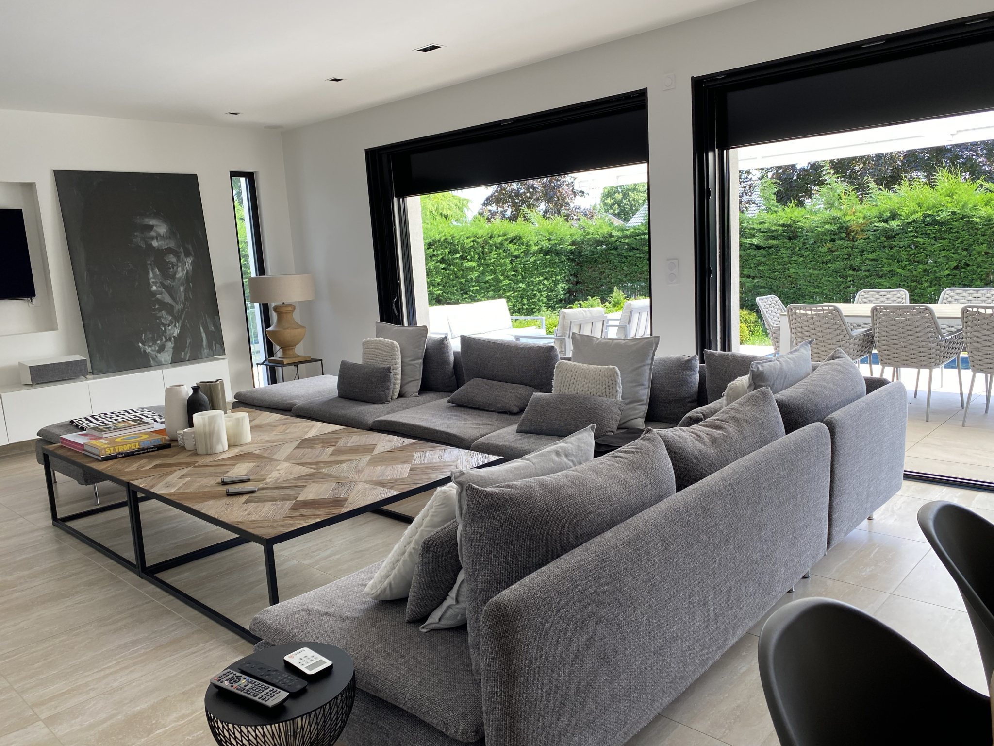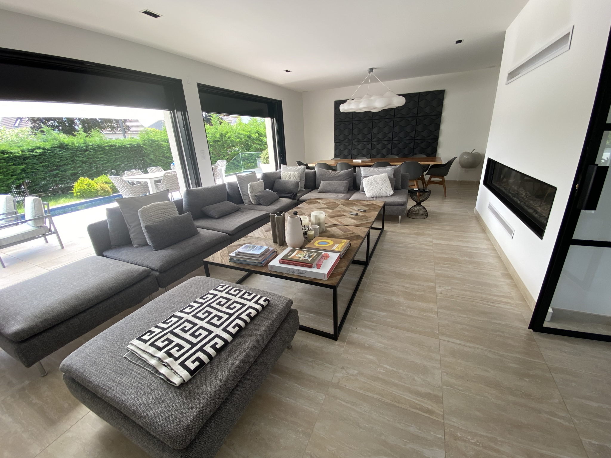 Vaste cuisine ouverte sur salon, séjour et salle à manger, terrasse et piscine.