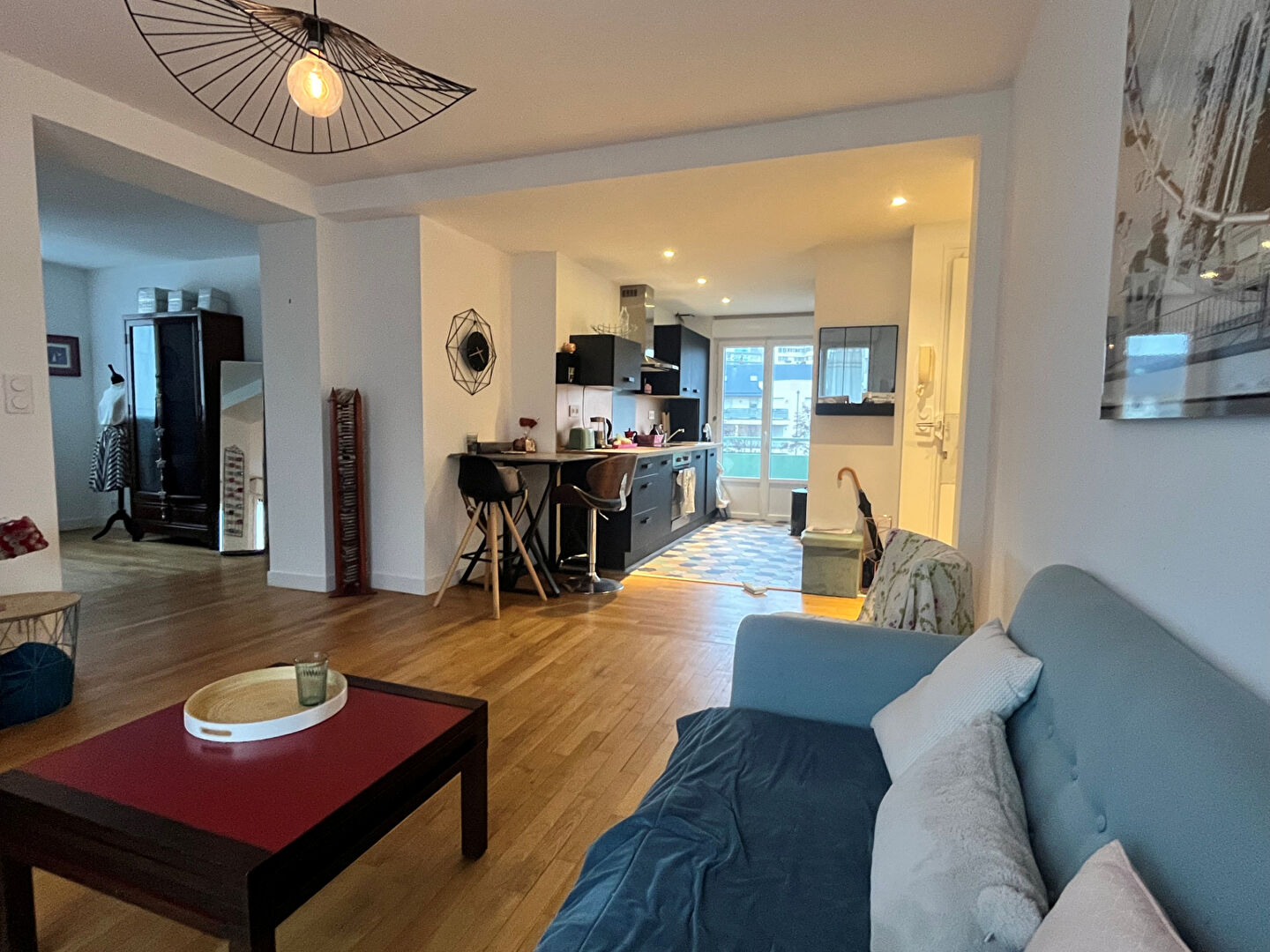 L'appartement comprend : une entrée avec placard, une pièce de vie lumineuse jouissant d une triple exposition, deux balcons dont un au sud et un avec vue sur la rivière, une jolie cuisine aménagée, deux chambres et la possibilité d'en créer une troisième, salle d'eau récente et WC séparés.