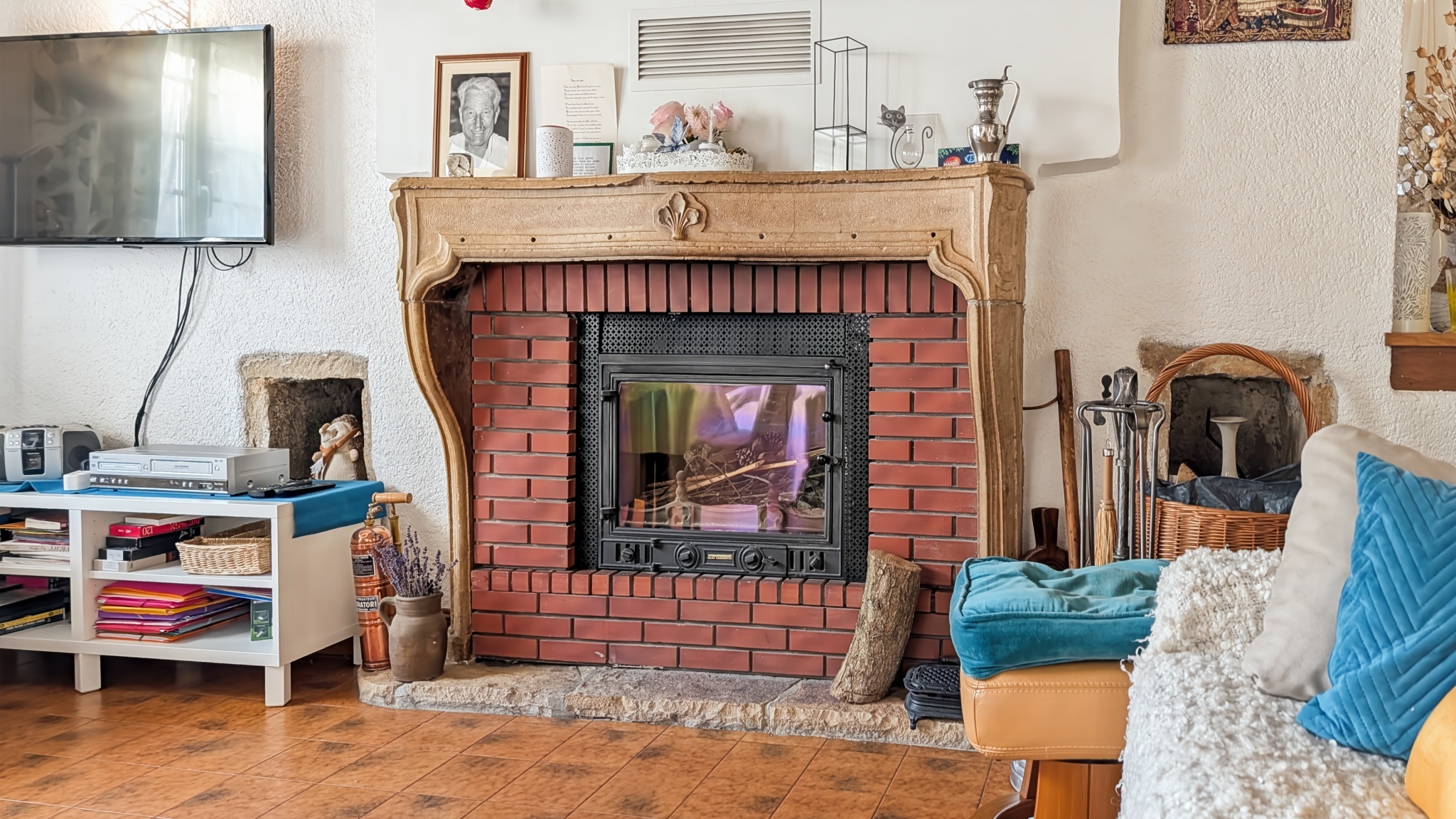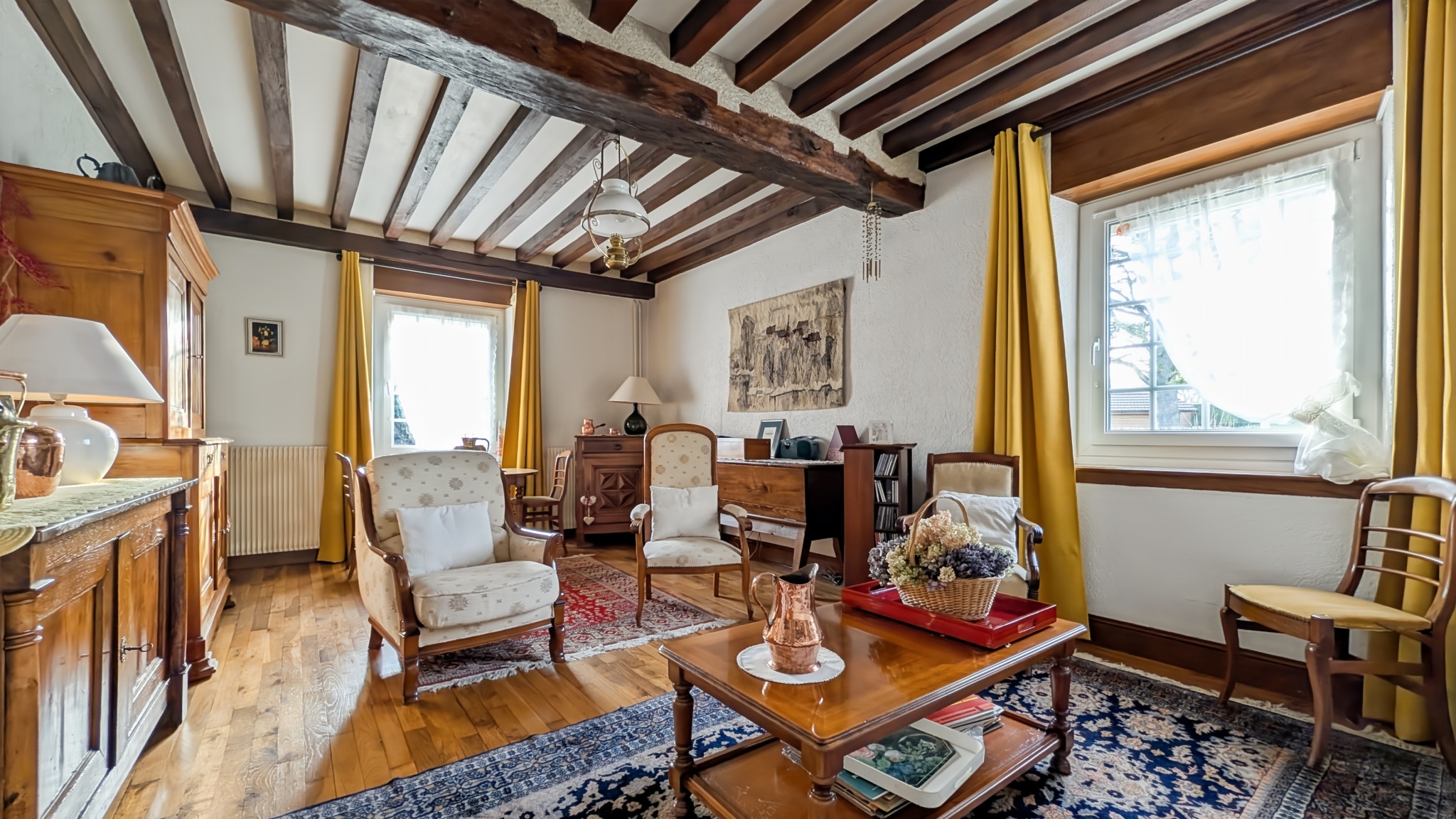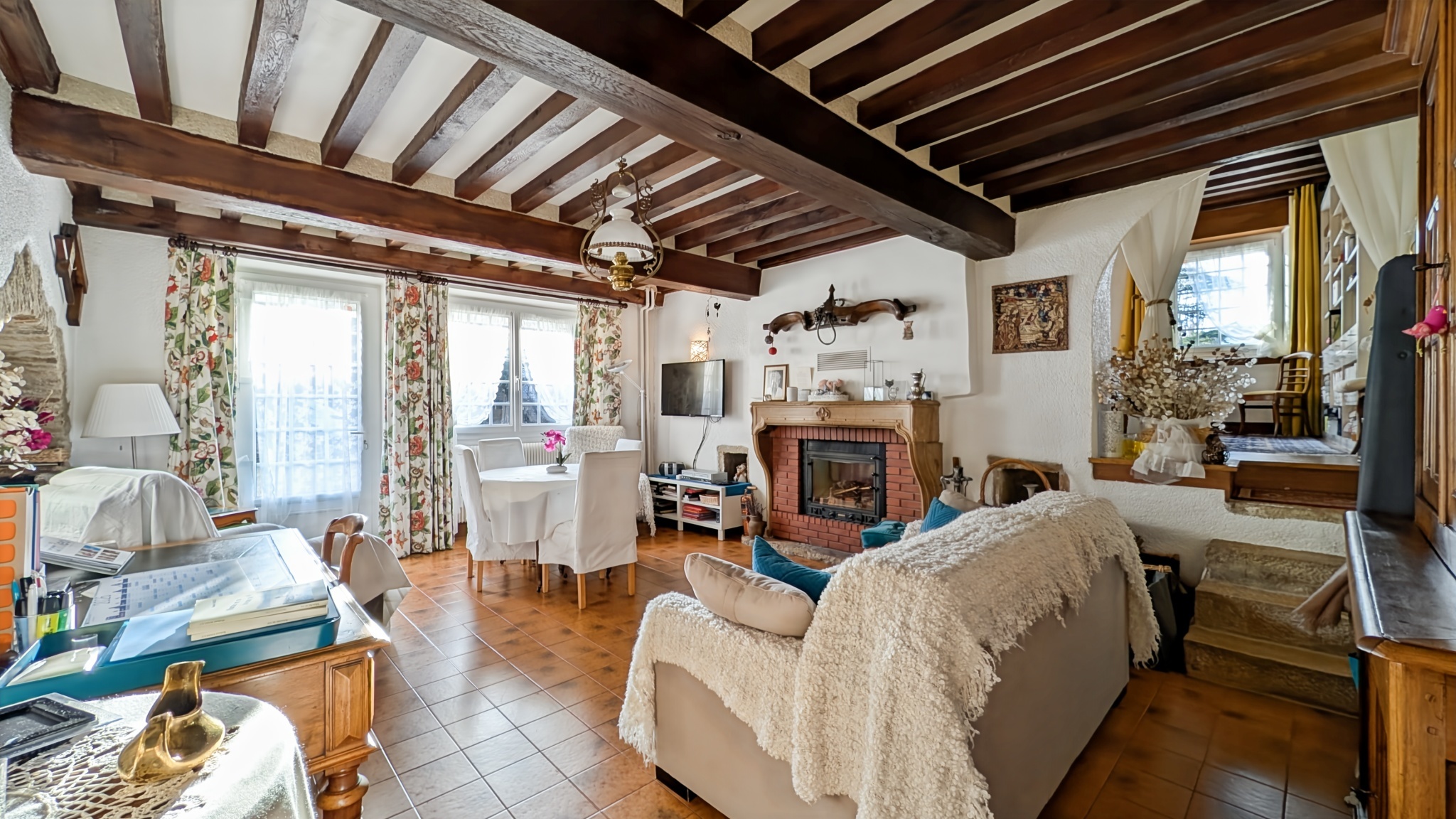 Salon et séjour lumineux dotés d'une belle cheminée en pierre et de poutres à la Française .