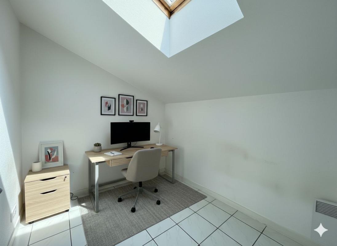 La partie nuit propose une chambre avec rangements, un bureau, une salle d'eau et un WC indépendant.